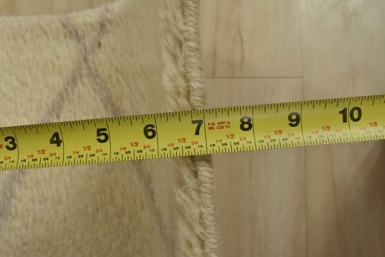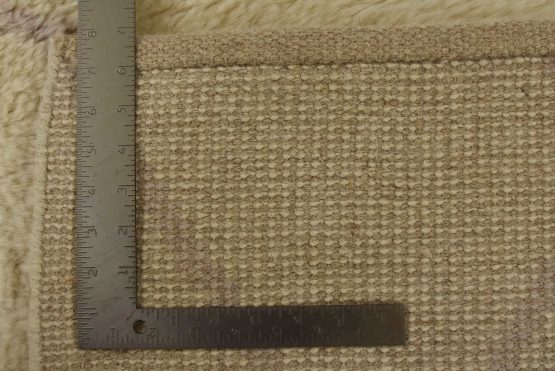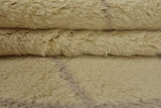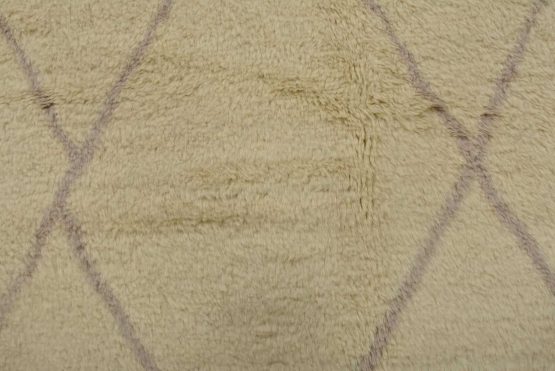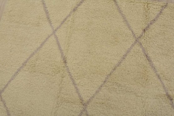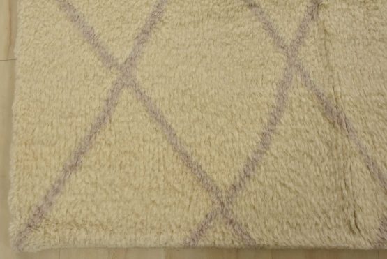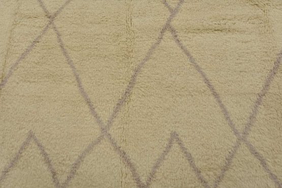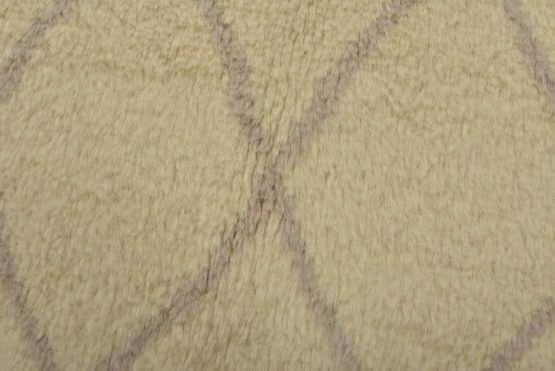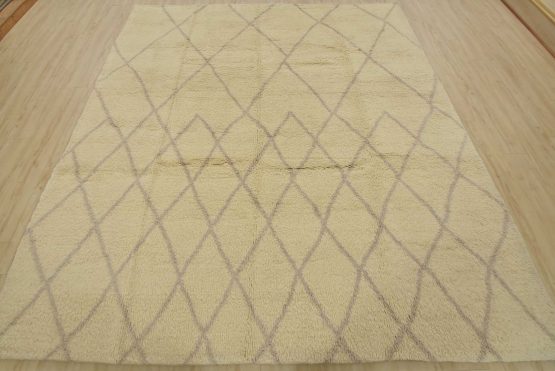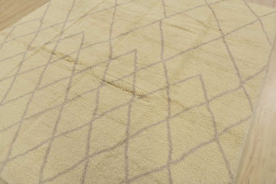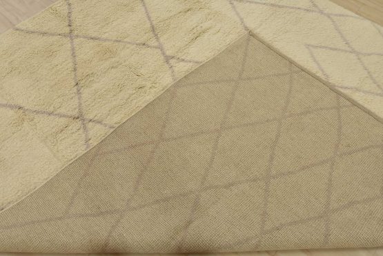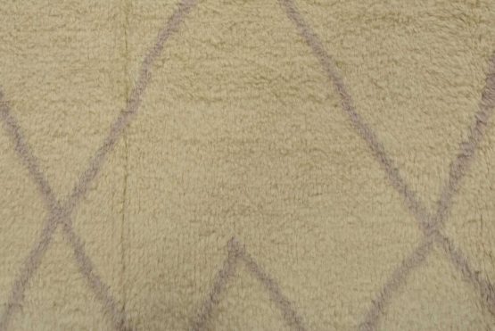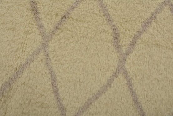 A contemporary Moroccan rug hand-knotted with an all-wool pile on a cotton foundation. This plush area rug features a subtle all-over geometric design set against an ivory background. It is new and in excellent condition.