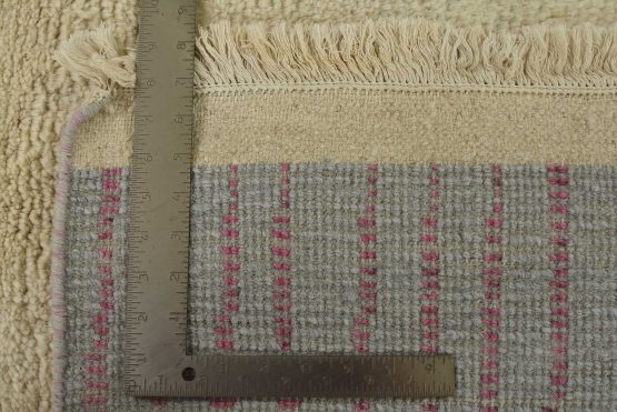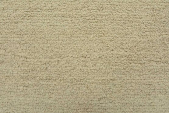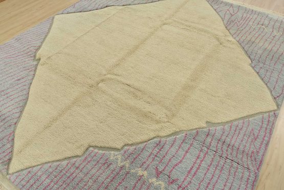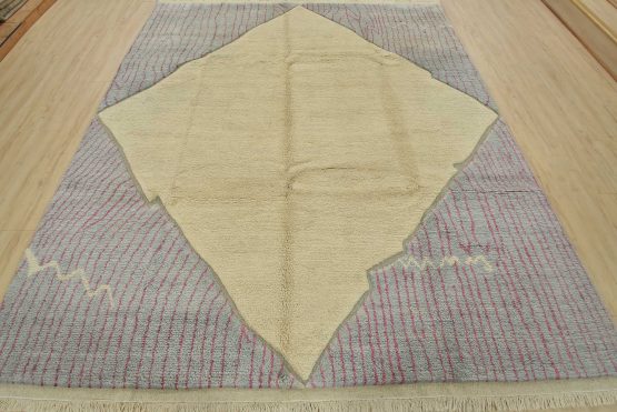 A contemporary Moroccan rug hand-knotted with an all-wool pile on a cotton foundation. This plush area rug features a solid ivory background adorned with geometric patterns in the spandrels. It is new and in excellent condition.