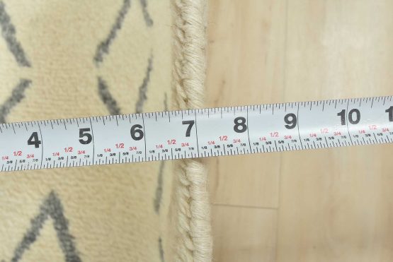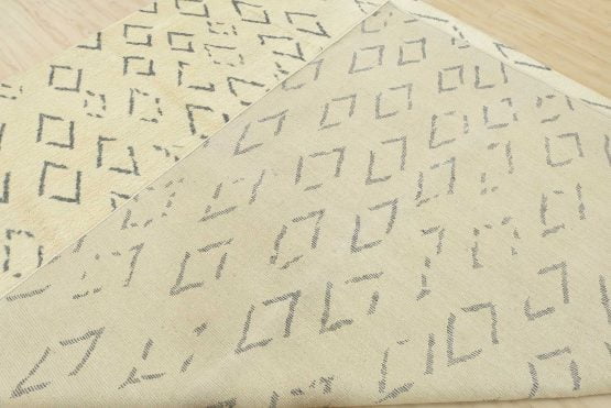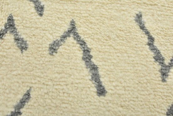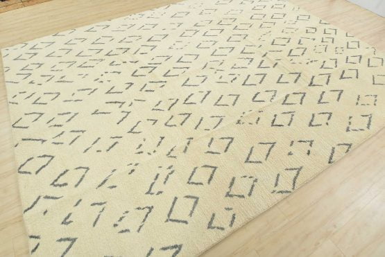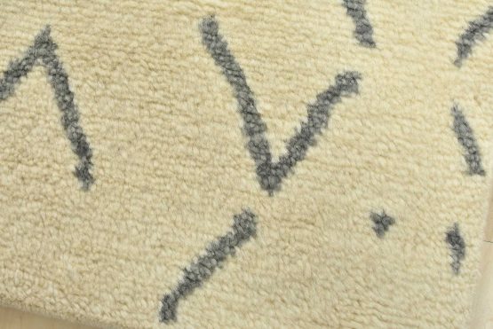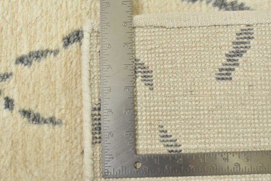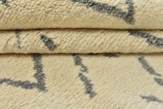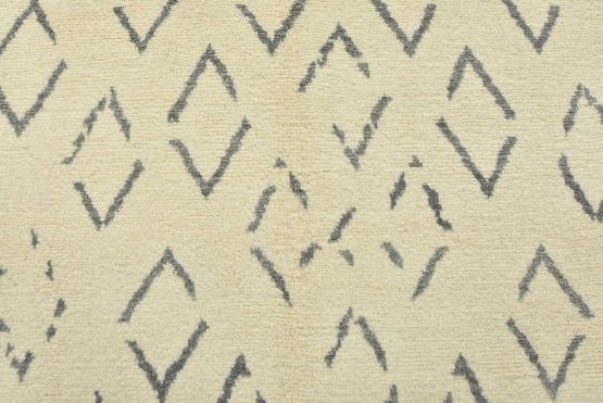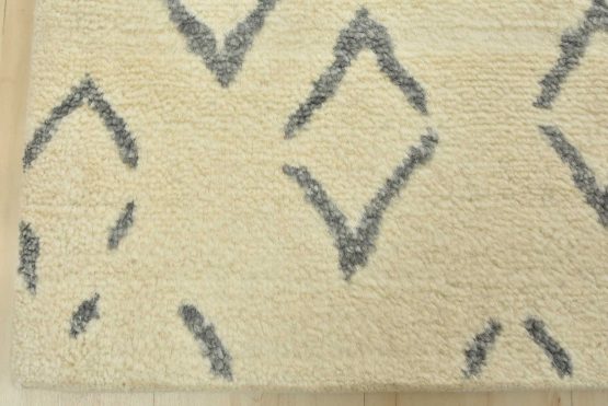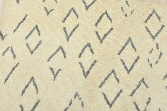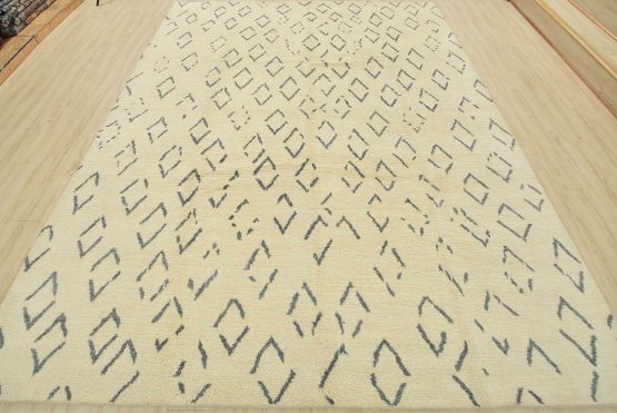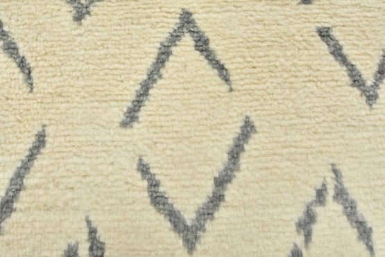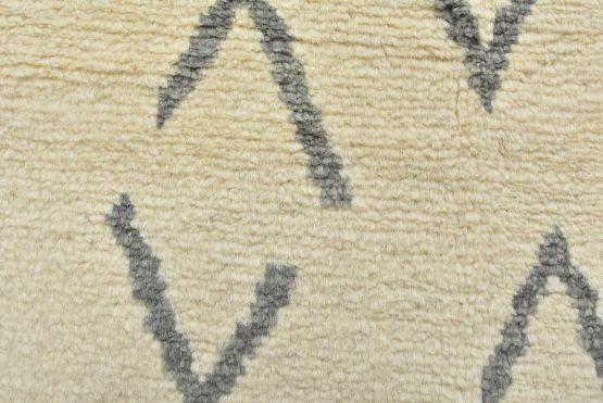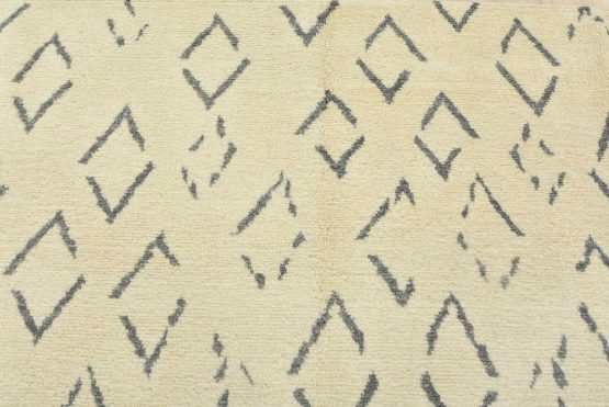 A contemporary Moroccan rug hand-knotted with an all-wool pile on a cotton foundation. This plush area rug features an all-over geometric pattern set against an ivory-colored background. It is new and in excellent condition.