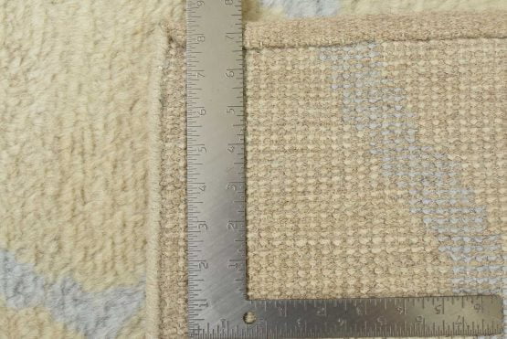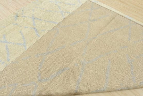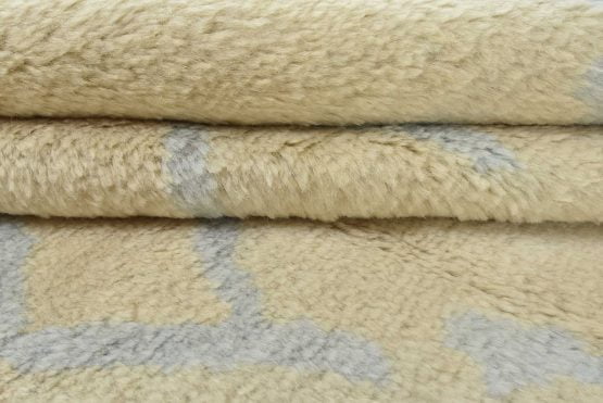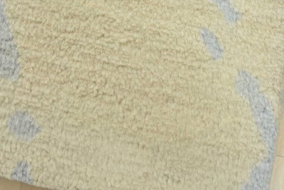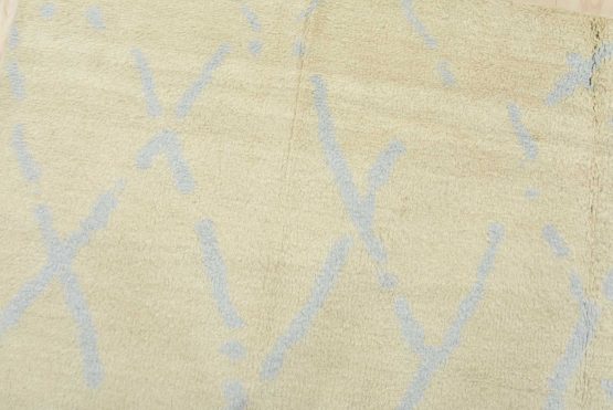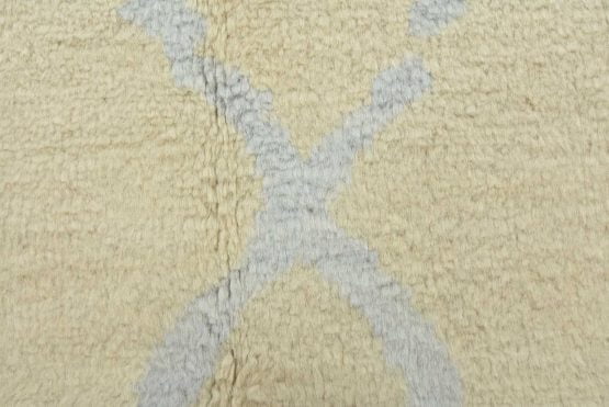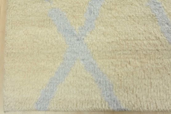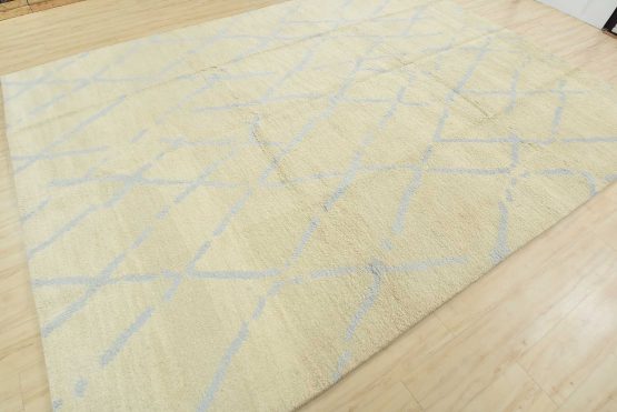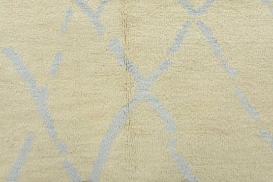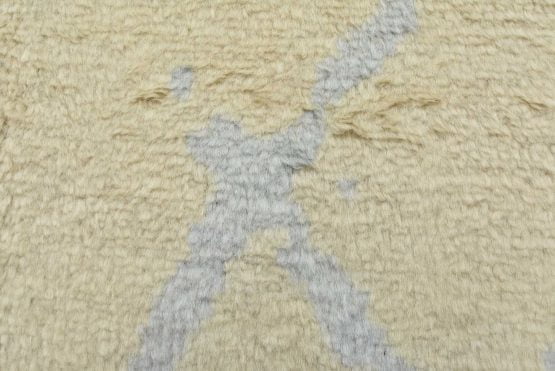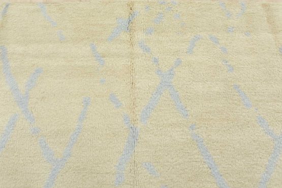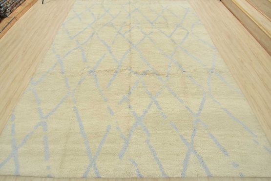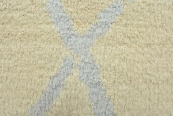 A contemporary Moroccan rug hand-knotted with an all-wool pile on a cotton foundation. This plush area rug features a subtle all-over geometric design set against an ivory-colored background. It is new and in excellent condition.