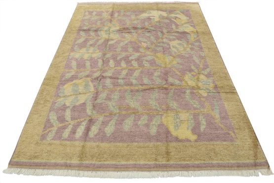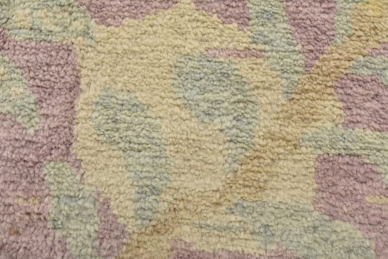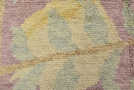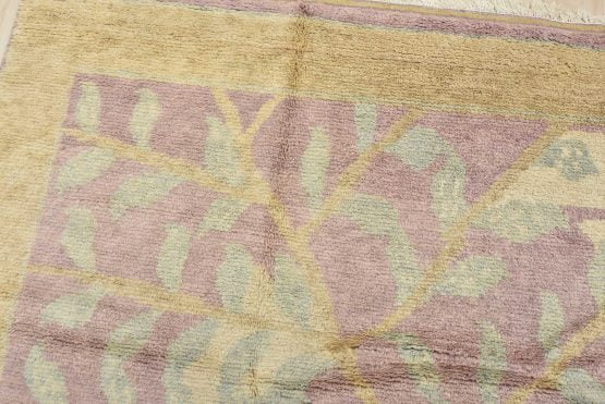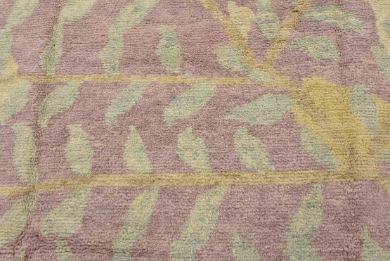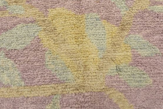A contemporary Moroccan rug hand-knotted with an all-wool pile on a cotton foundation. This area rug features an all-over large-scale botanical design set against a pink background. It is new and in excellent condition.