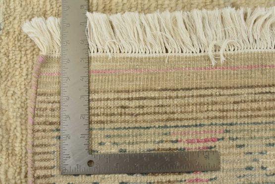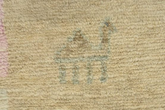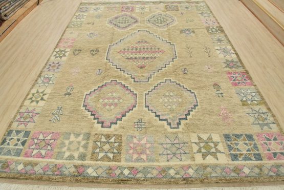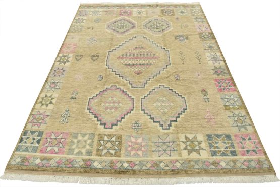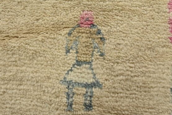 A contemporary Moroccan rug hand-knotted with an all-wool pile on a cotton foundation. This area rug features a central geometric medallion surrounded by geometric motifs with human and animal figures set againt a beige background. It is new and in excellent condition.