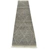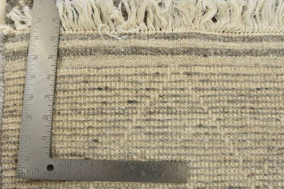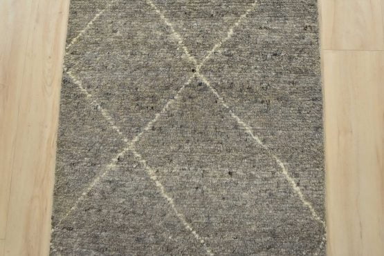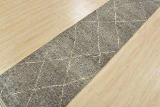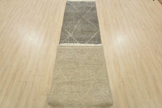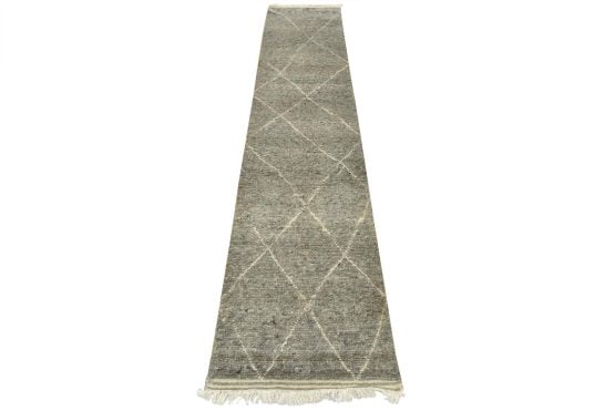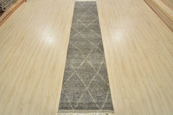 A contemporary Moroccan runner hand-knotted with an all-wool pile on a cotton foundation. This rug features a geometric pattern set against a gray background. It is new and in excellent condition.