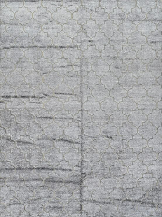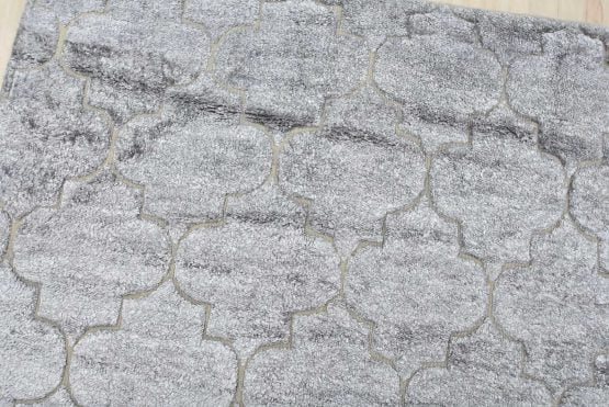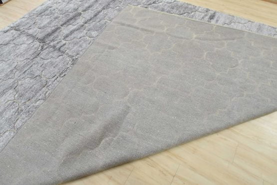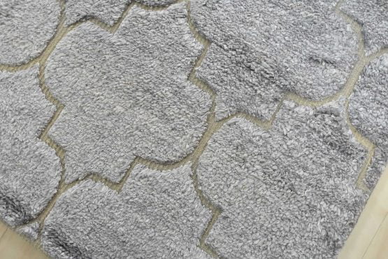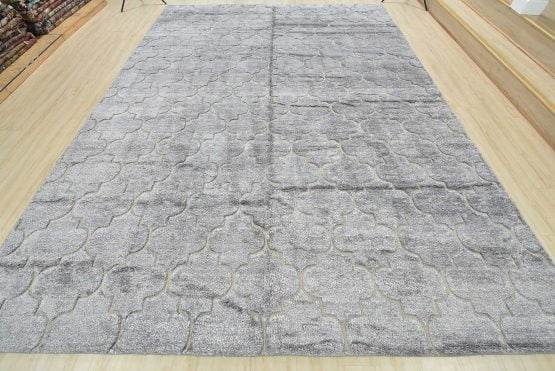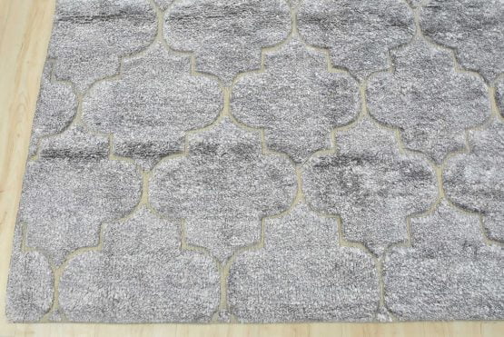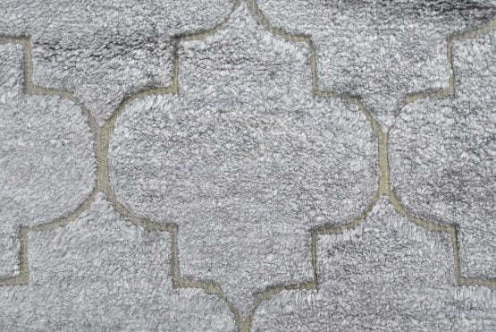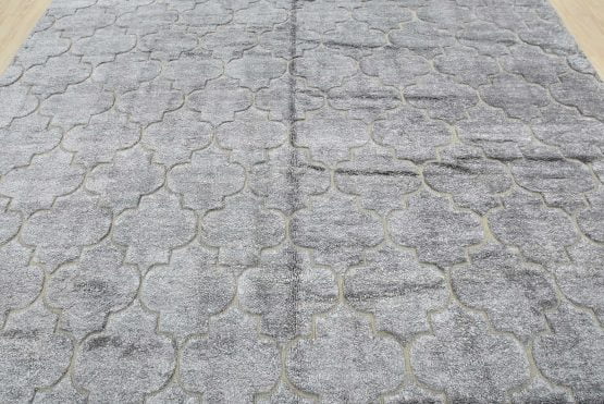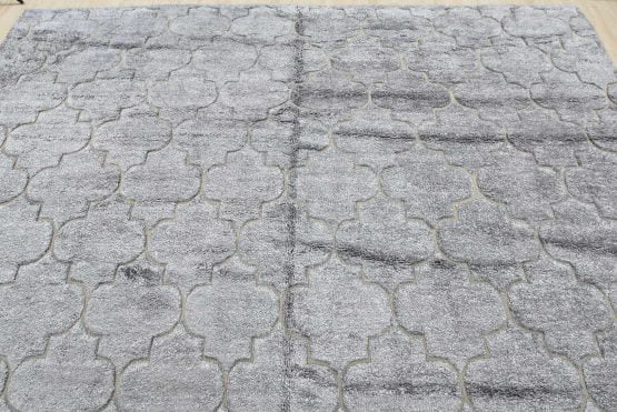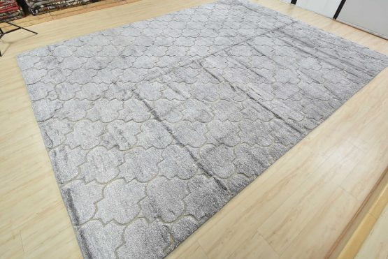 A contemporary Moroccan Trellis rug hand-knotted with a wool and viscose blended pile on a cotton foundation. This area rug features an all-over trellis pattern with high-and-low pile heights. It is new and in excellent condition.