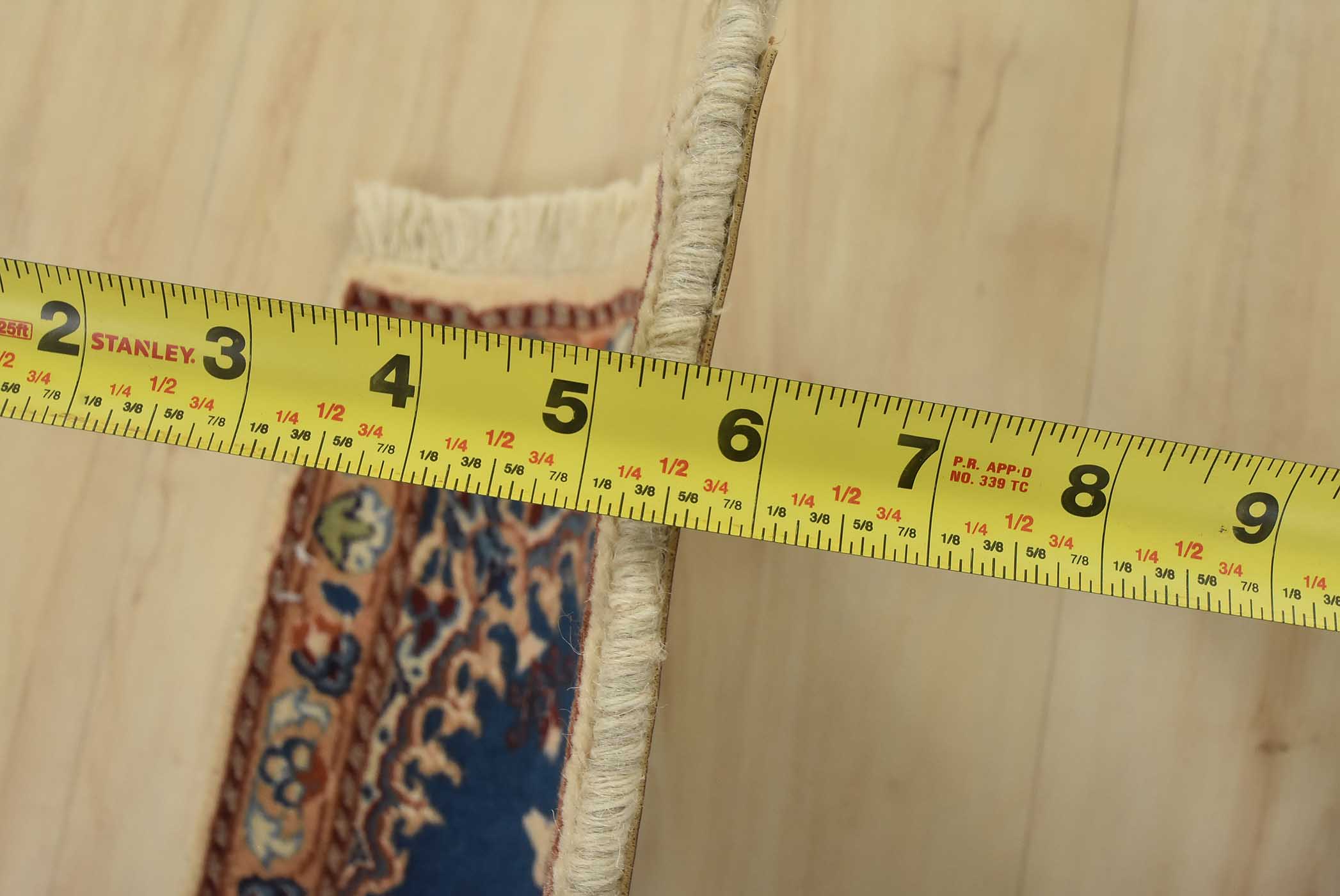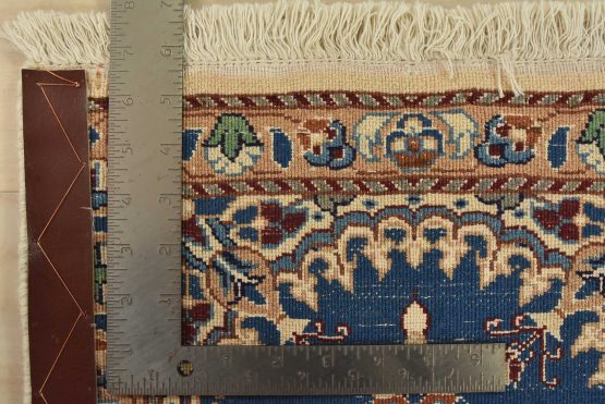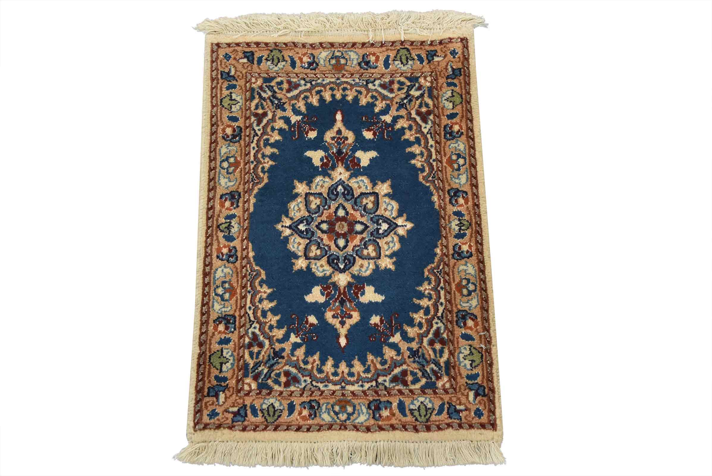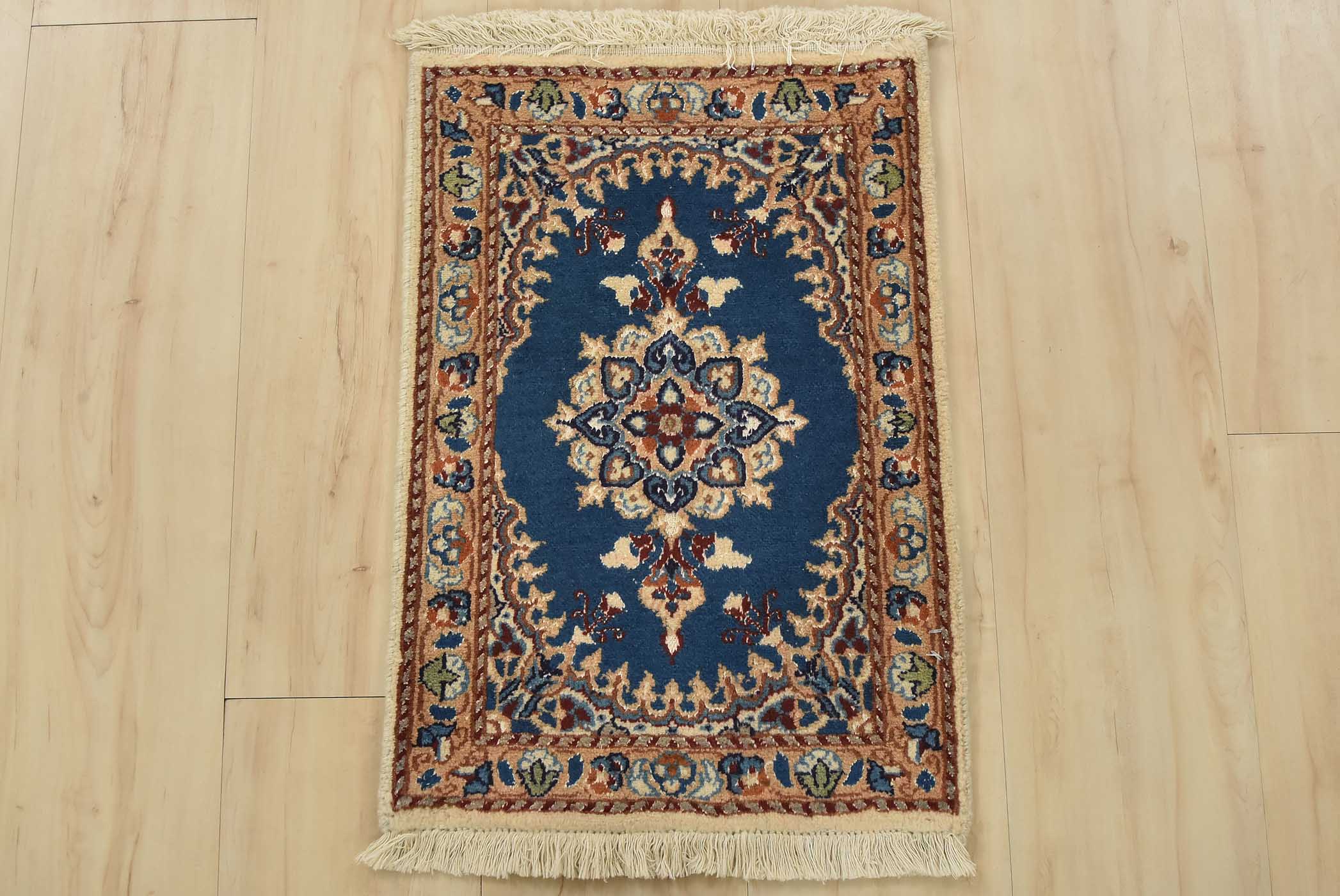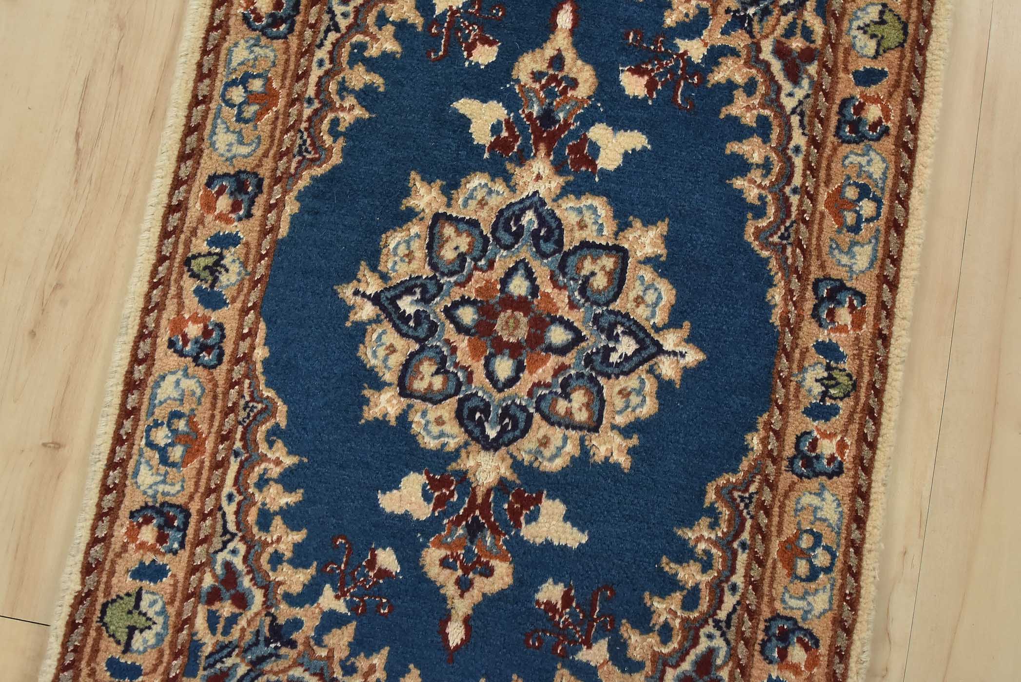 An authentic vintage traditional Nain rug hand-knotted with fine wool and natural dyes. This oriental rug features a central medallion set against a blue background. It has a full wool pile with no worn areas and is in very good condition.