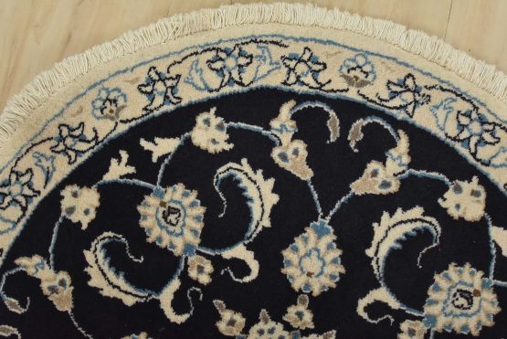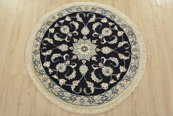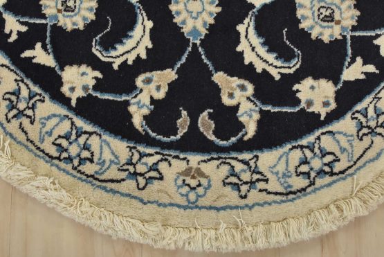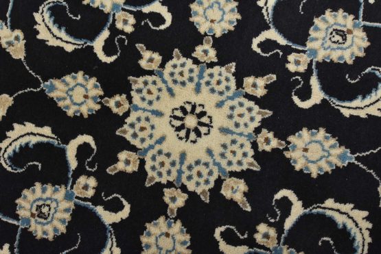 An authentic vintage traditional Nain rug hand-knotted with fine wool and natural dyes. This oriental rug features a central medallion surrounded by a botanical design set against a dark blue background. It has a full wool pile with no worn areas and is in very good condition.
