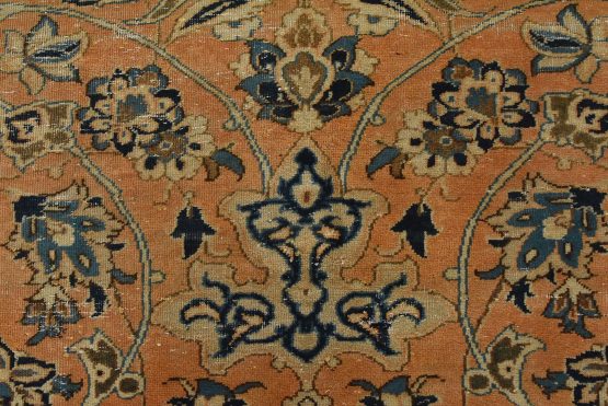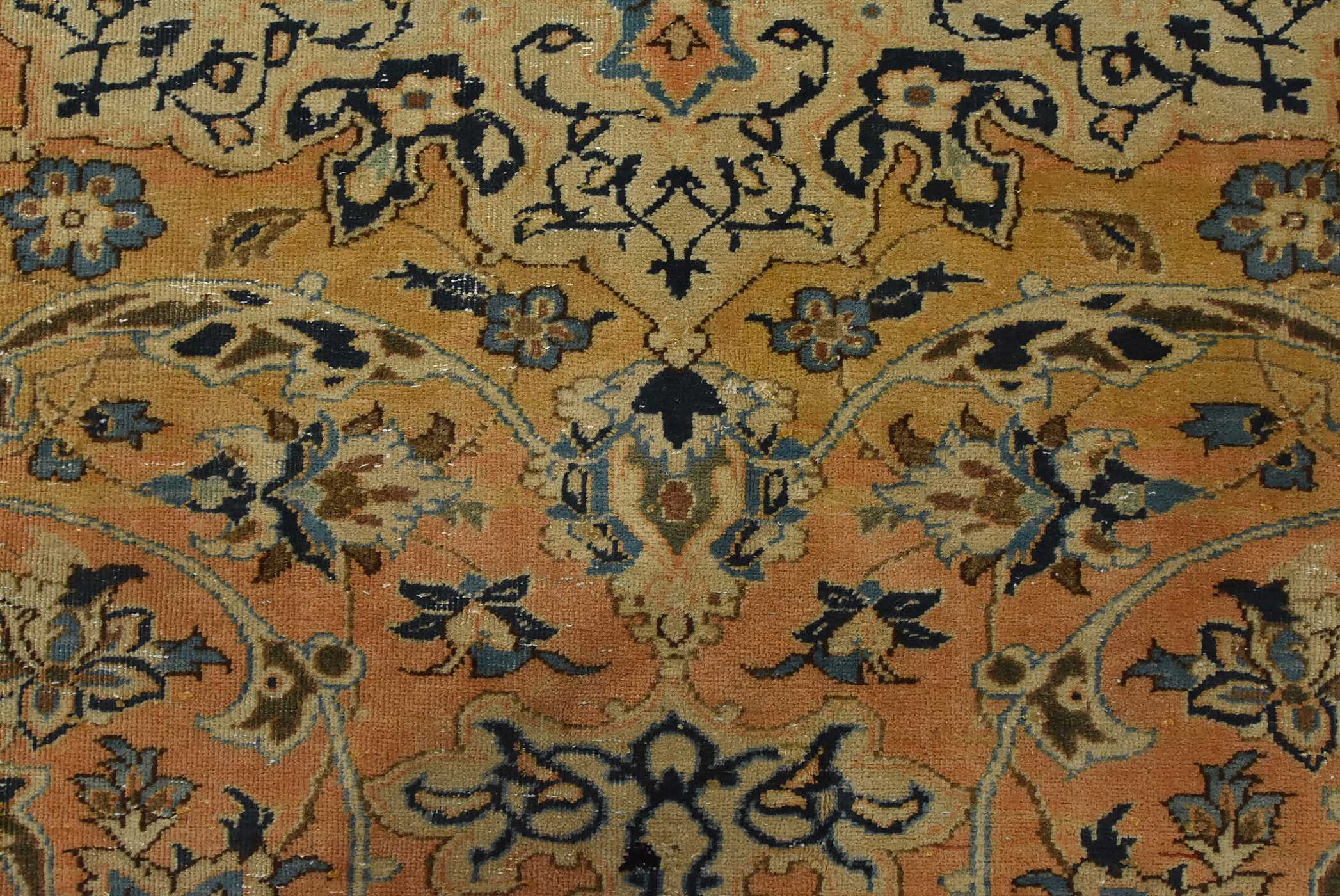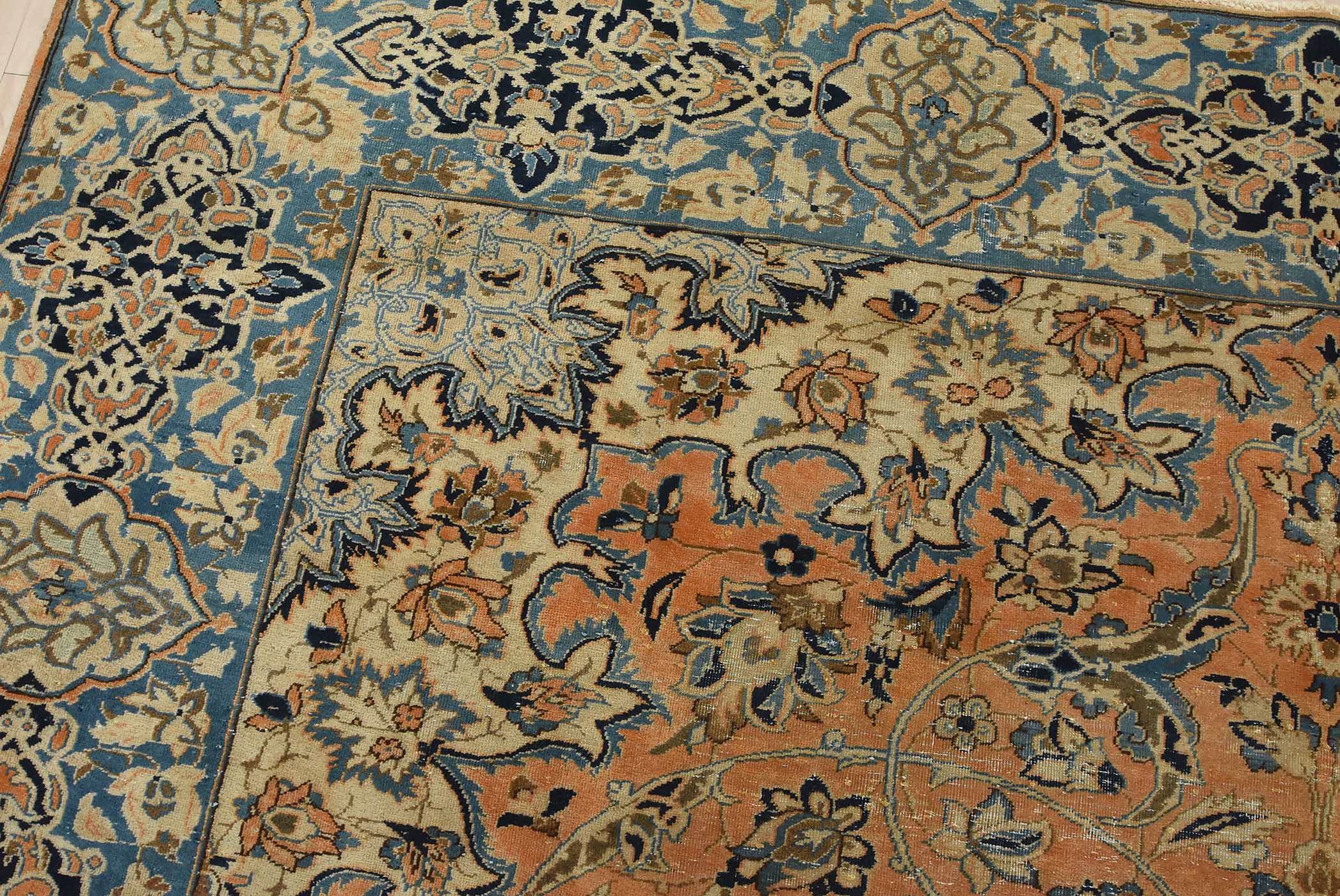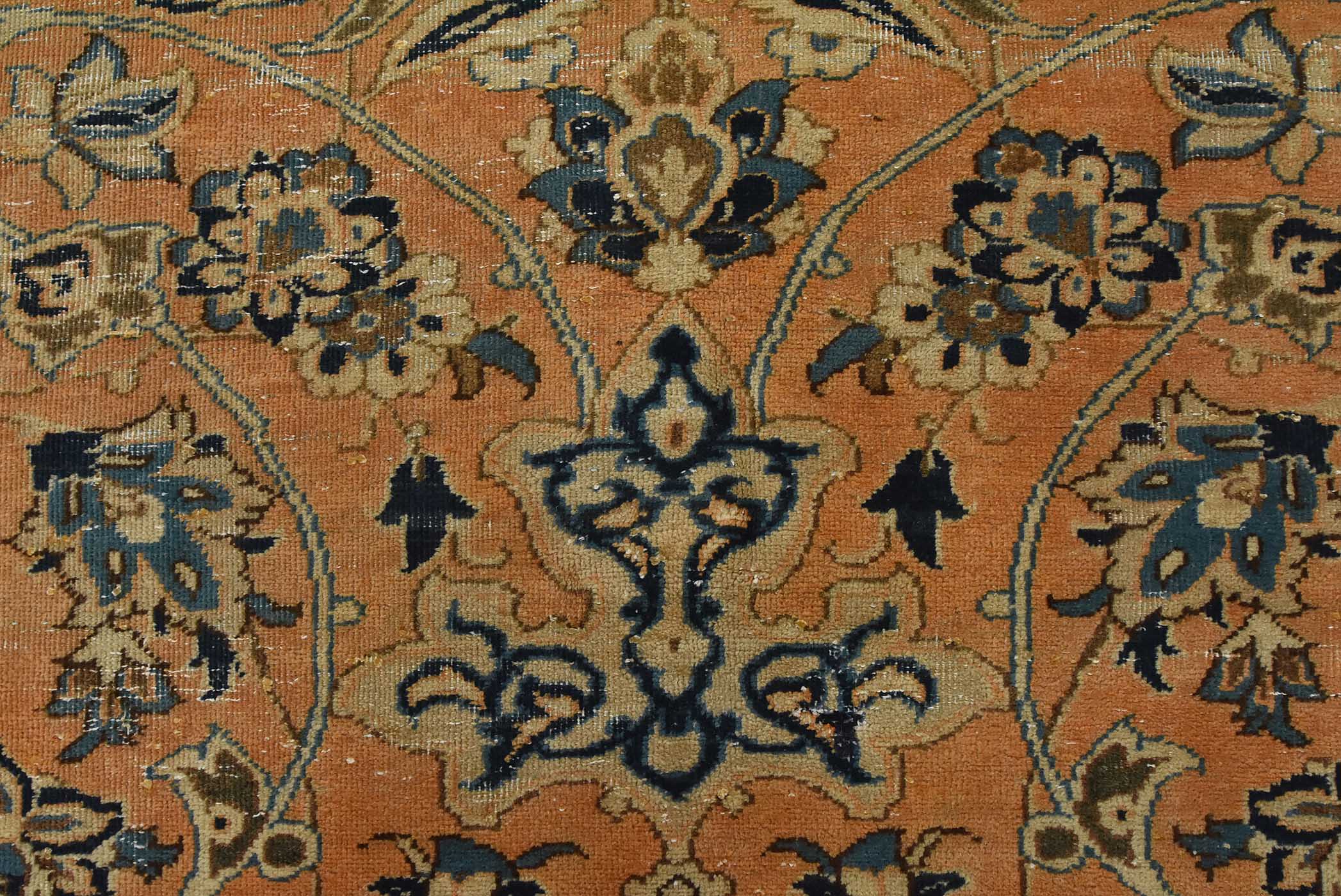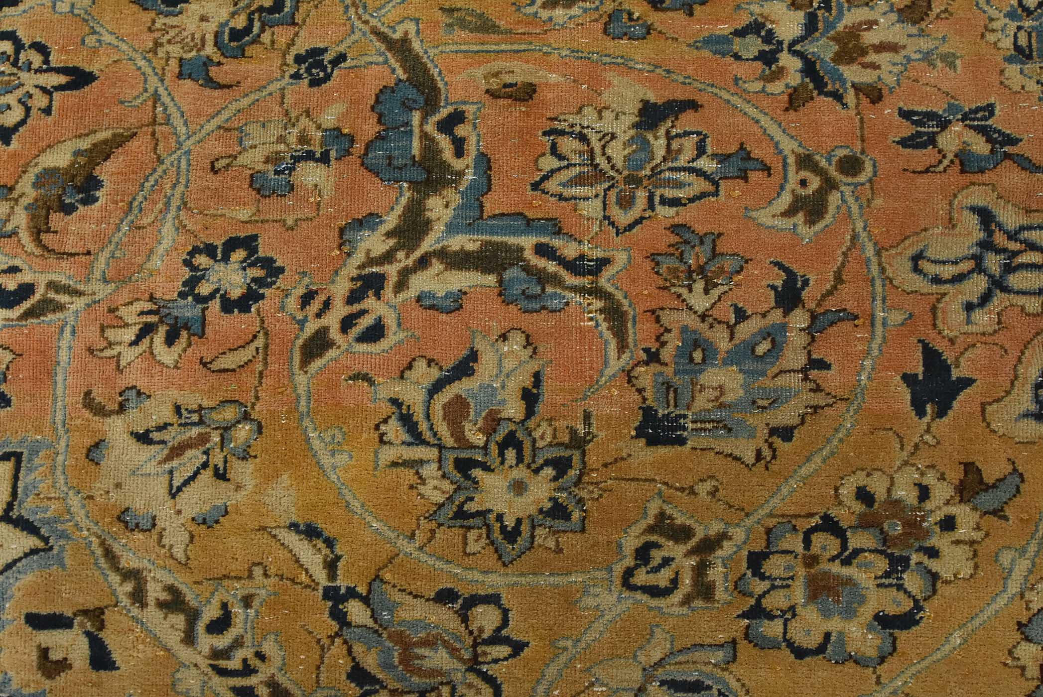 An authentic vintage traditional Najafabad rug hand-knotted with fine wool and natural dyes. This oriental rug features a central medallion surrounded by a floral design set against an orange background. It has a low wool pile, is worn and distressed, and has minor imperfections (see photos). However, it is in very good condition.