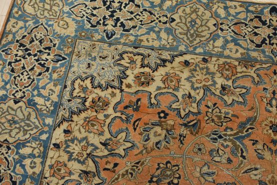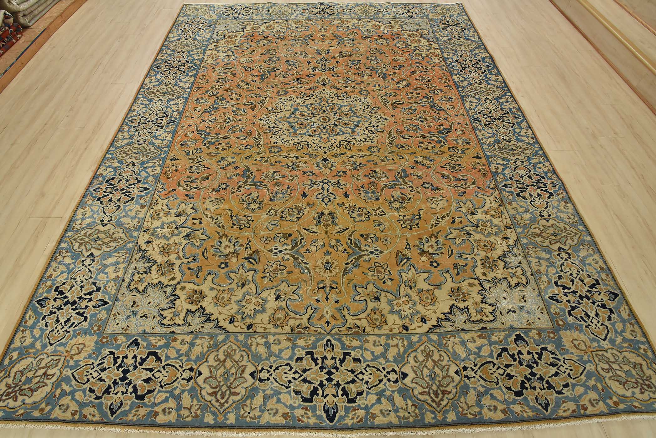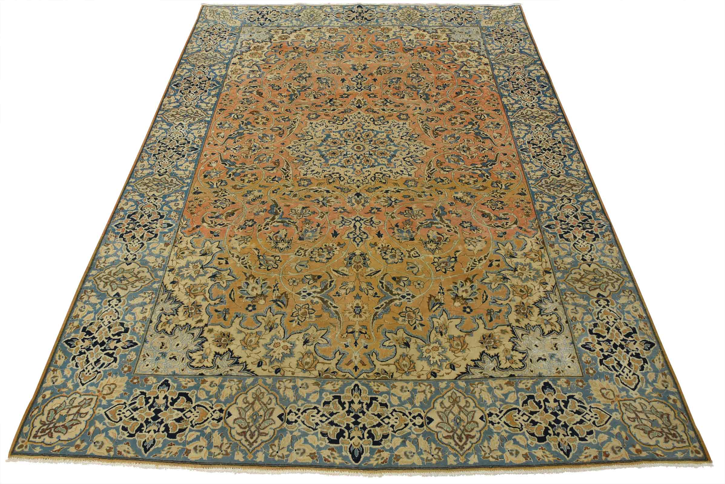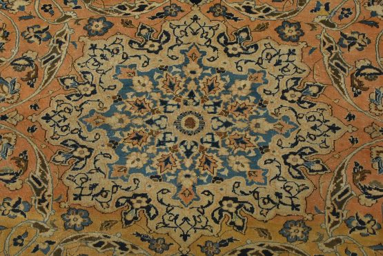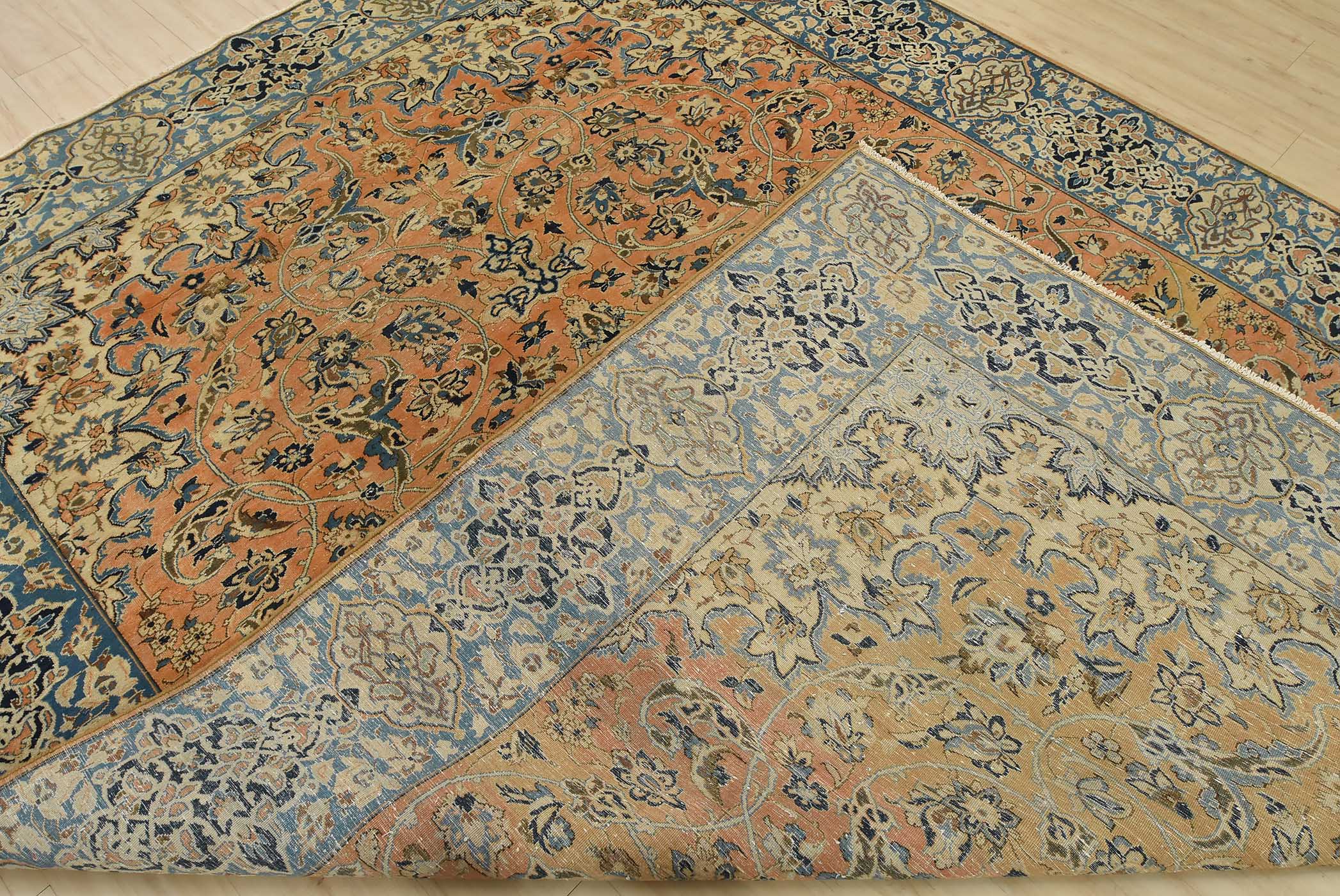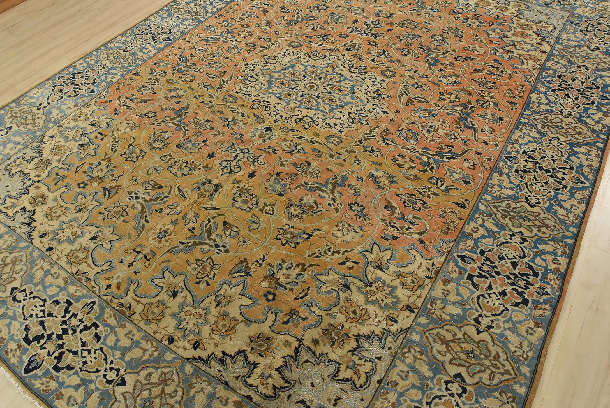 An authentic vintage traditional Najafabad rug hand-knotted with fine wool and natural dyes. This oriental rug features a central medallion surrounded by a floral design set against an orange background. It has a low wool pile, is worn and distressed, and has minor imperfections (see photos). However, it is in very good condition.