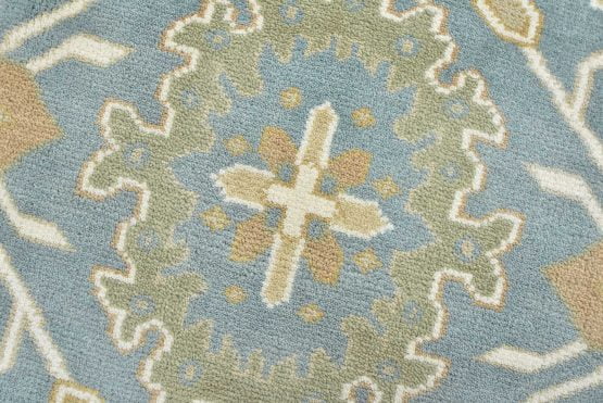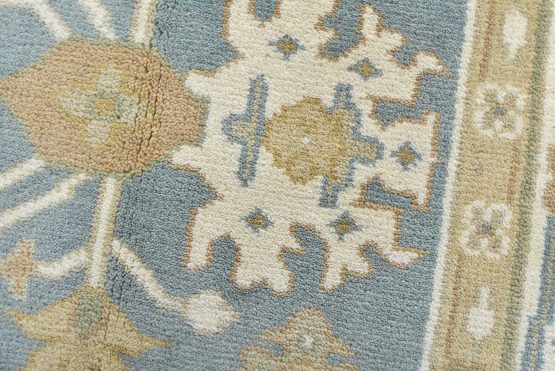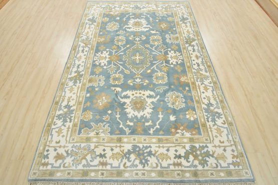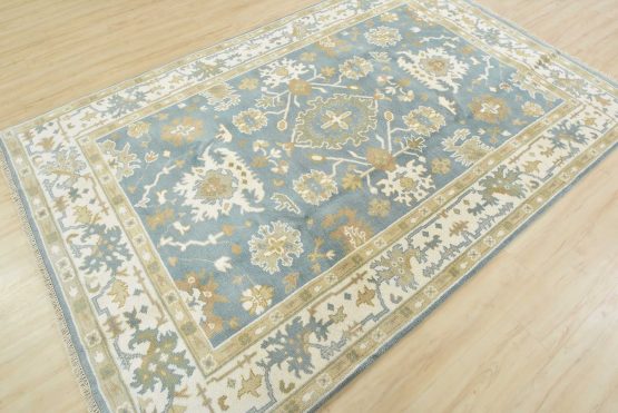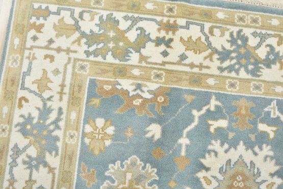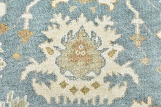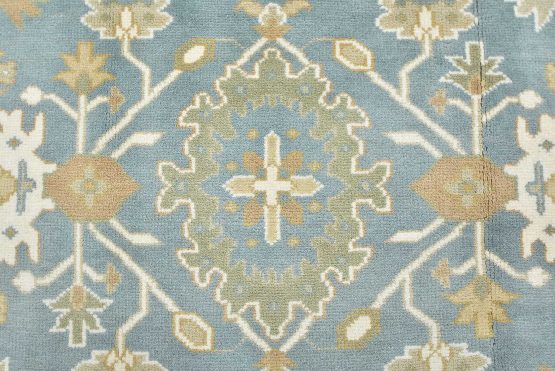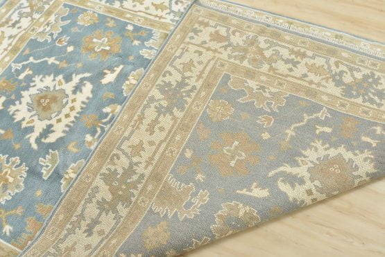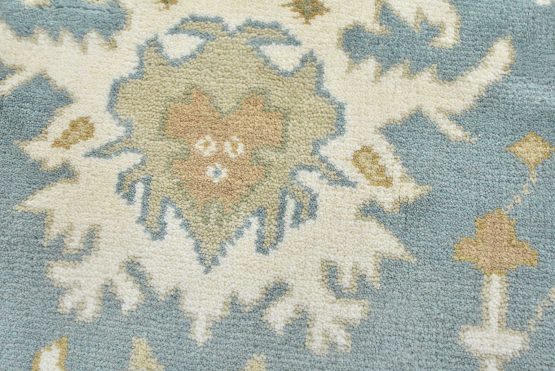 A traditional Oushak rug hand-knotted with an all-wool pile on a cotton foundation. This oriental rug features a central medallion surrounded by botanical motifs set against a light blue background. It is new and in excellent condition.