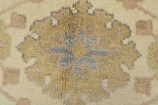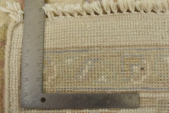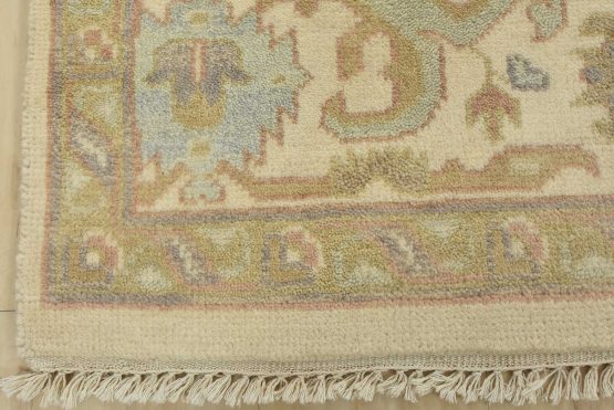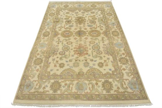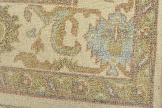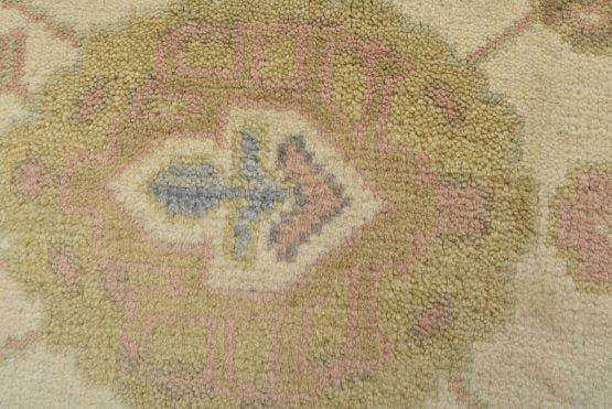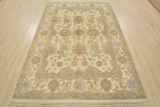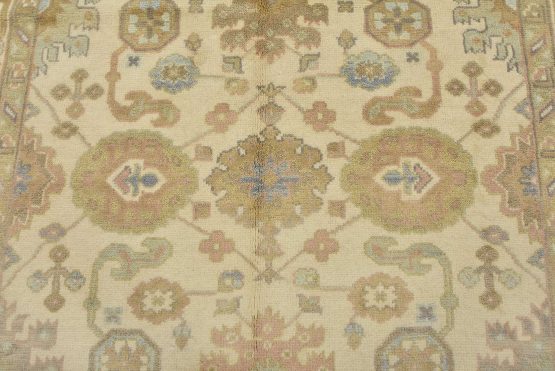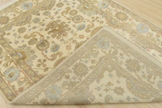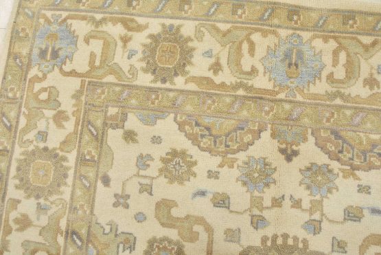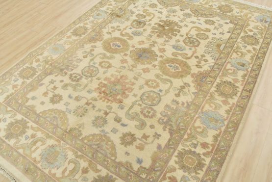 A modern traditional Oushak rug hand-knotted with an all-wool pile on a cotton foundation. This oriental rug features a subtle all-over botanical design set against an ivory background. It is new and in excellent condition.
