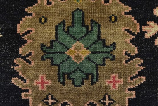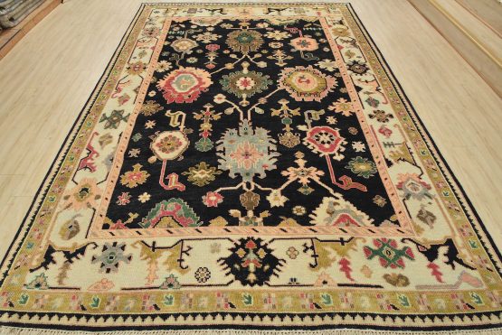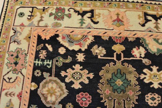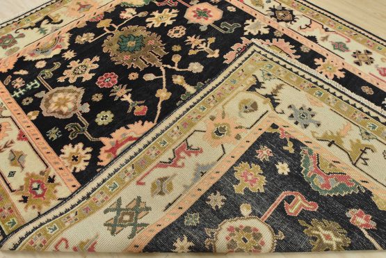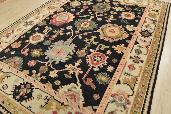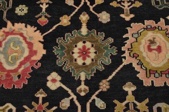A traditional Oushak rug hand-knotted with an all-wool pile on a cotton foundation. This oriental rug features an all-over botanical design set against a black background. It is new and in excellent condition.