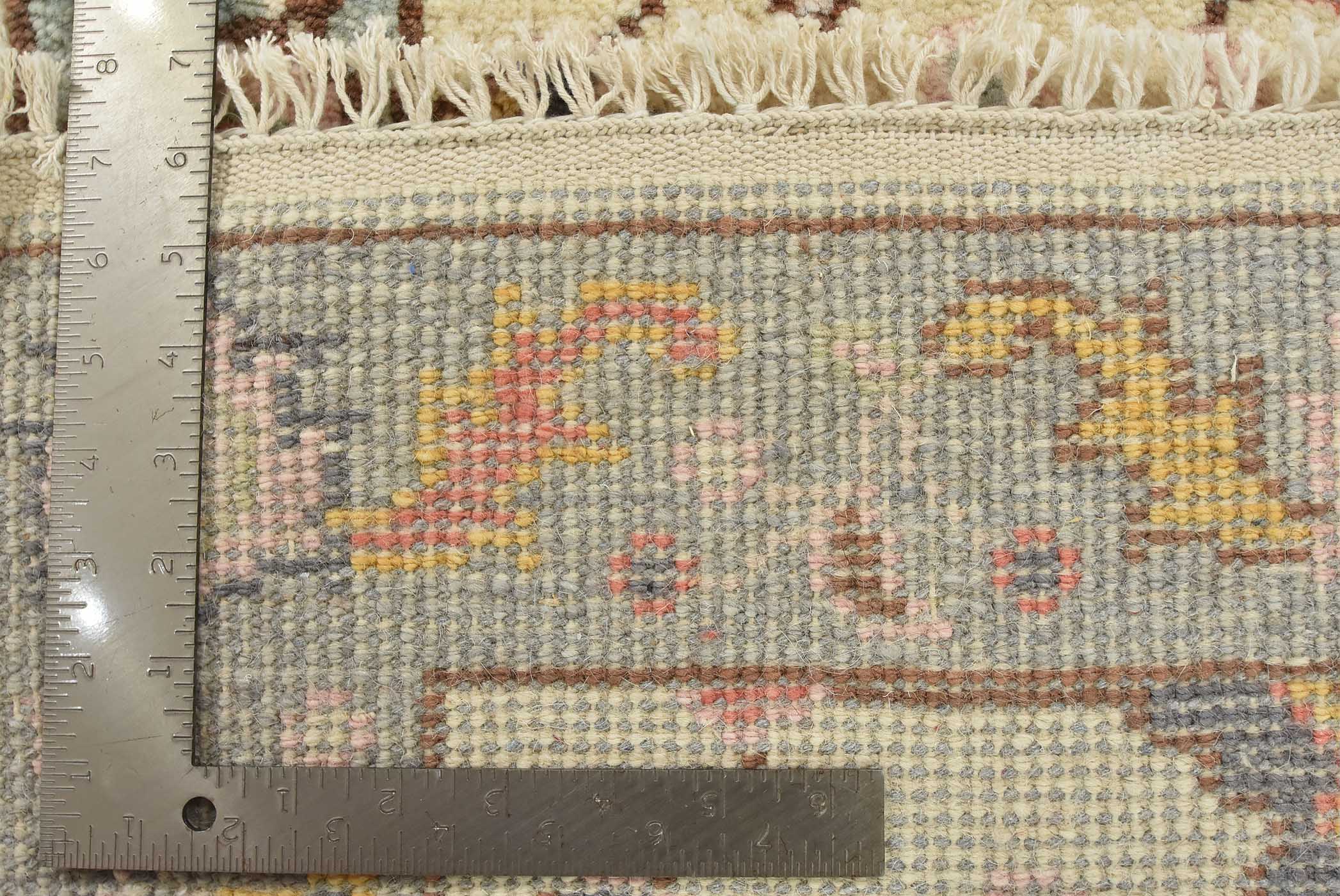 A modern traditional Oushak runner hand-knotted with an all-wool pile on a cotton foundation. This oriental rug features an all-over floral design set against an ivory background. It is new and in excellent condition.