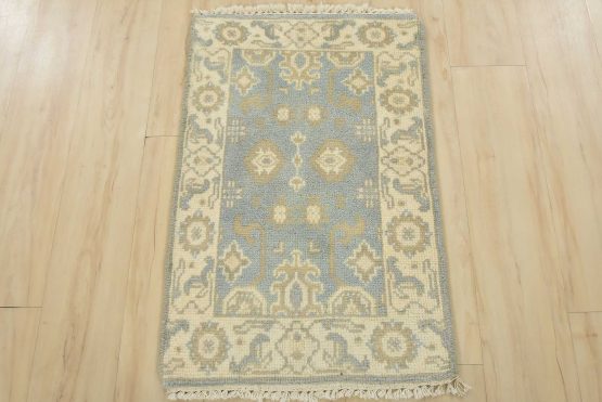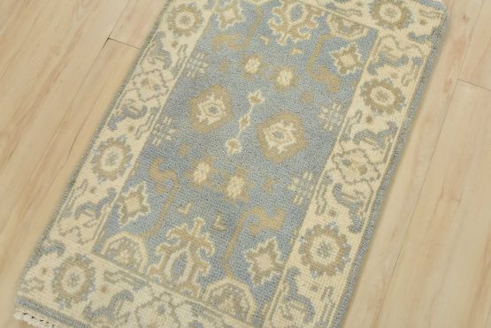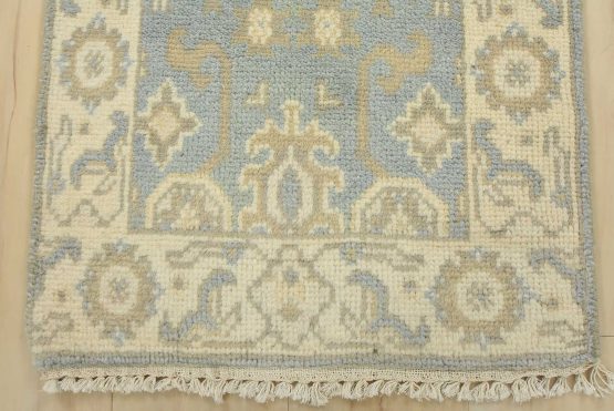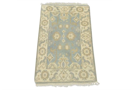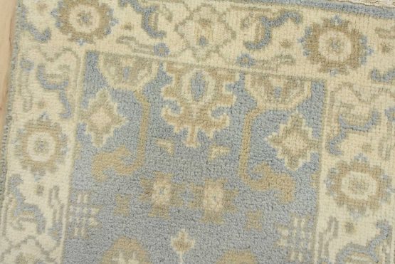 A traditional Oushak rug hand-knotted with an all-wool pile on a cotton foundation. This oriental rug features muted colors with an all-over botanical design set against a light blue background. It is new and in excellent condition.