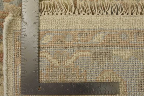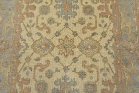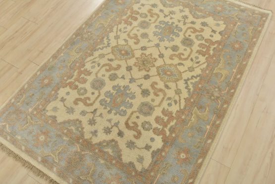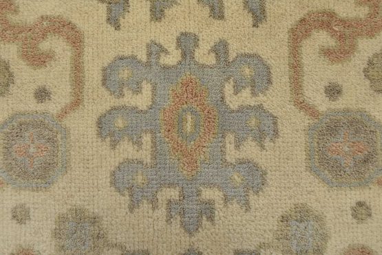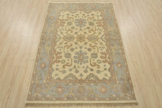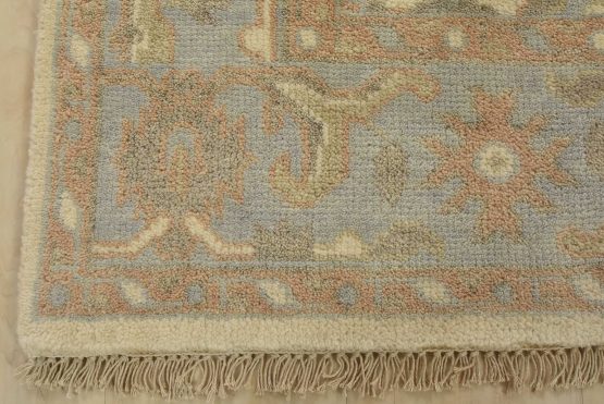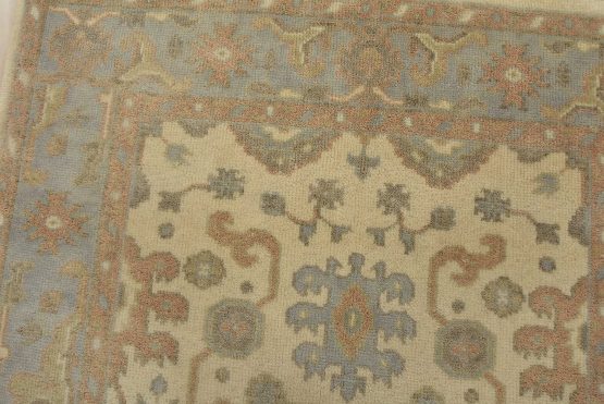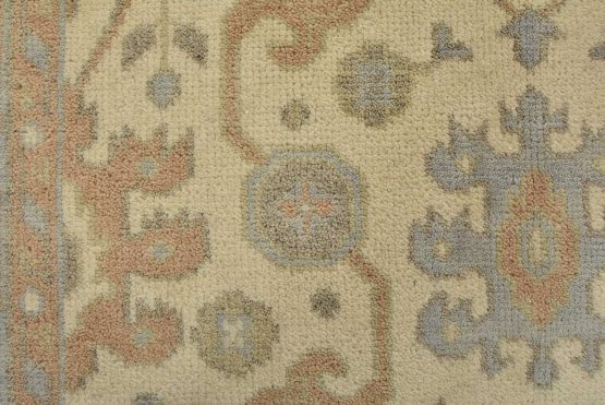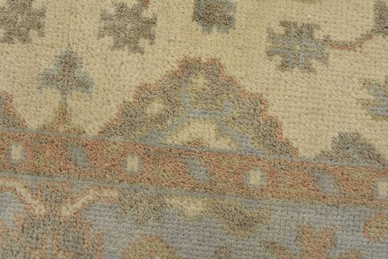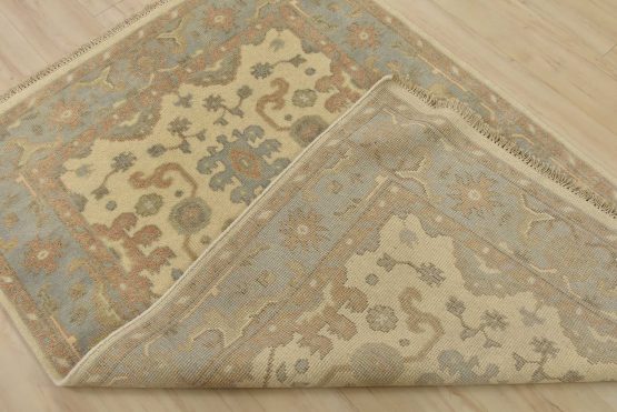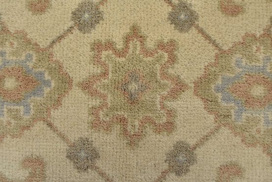 A traditional Oushak rug hand-knotted with an all-wool pile on a cotton foundation. This oriental rug features an all-over botanical design set against an ivory background. It is new and in excellent condition.