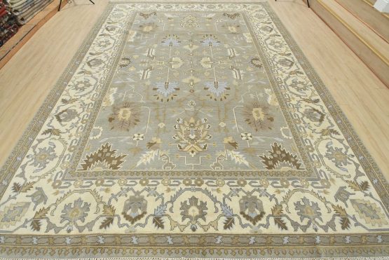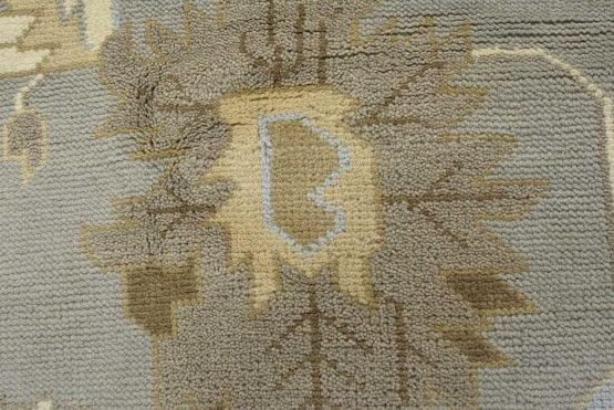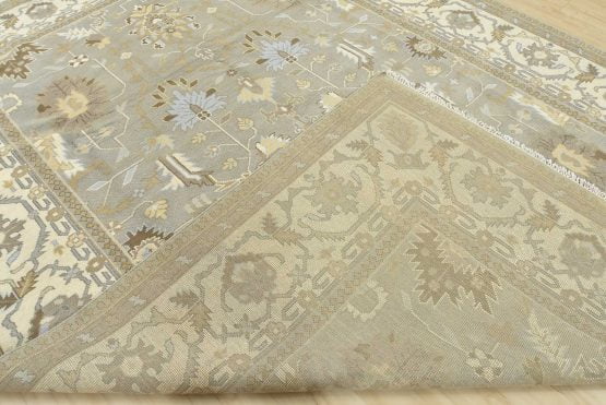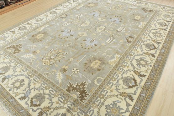 A modern traditional Oushak rug hand-knotted with an all-wool pile on a cotton foundation. This oriental rug features a subtle all-over botanical design set against a gray background. It is new and in excellent condition.