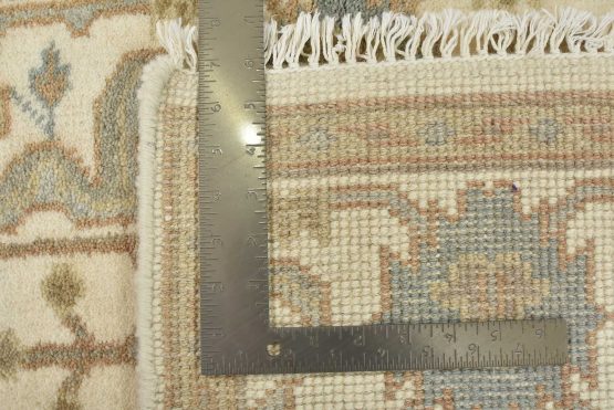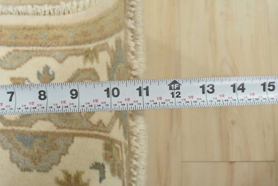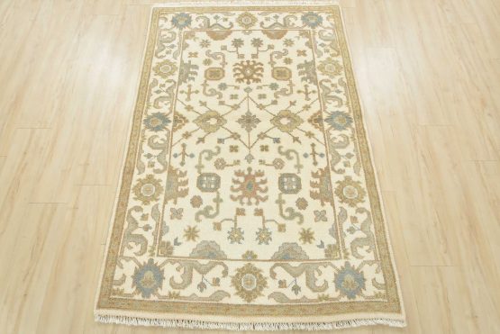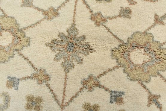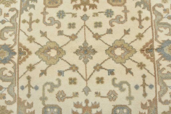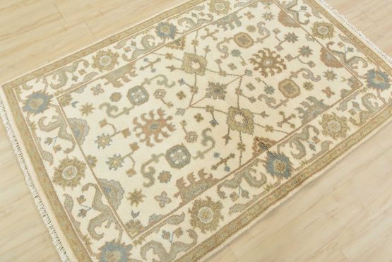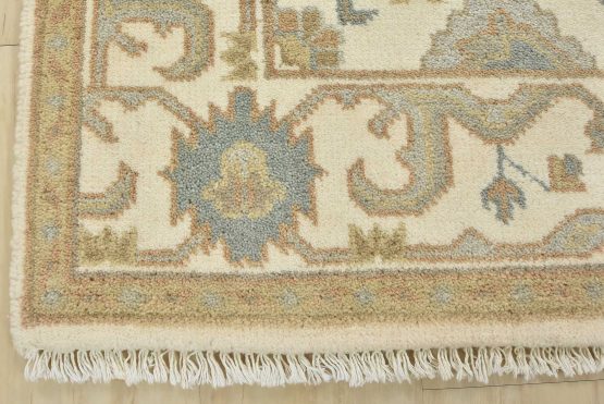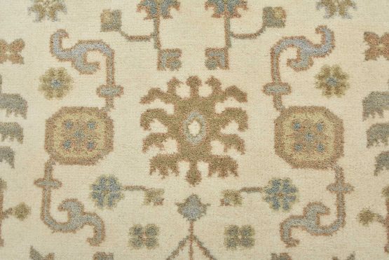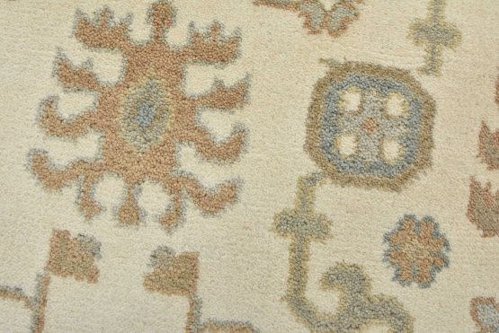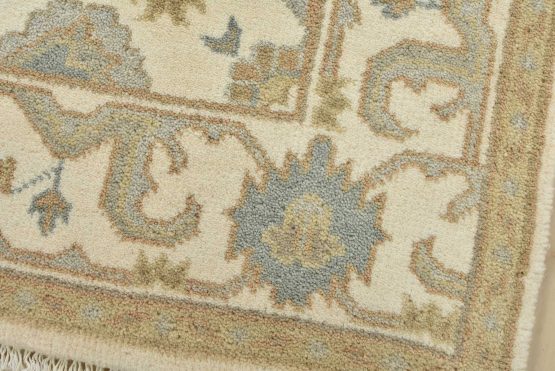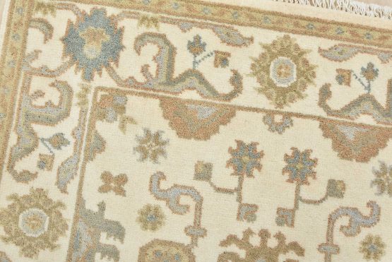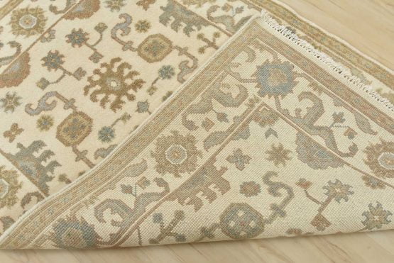A traditional Oushak rug hand-knotted with an all-wool pile on a cotton foundation. This oriental rug features an all-over botanical design set against an ivory background. It is new and in excellent condition.