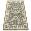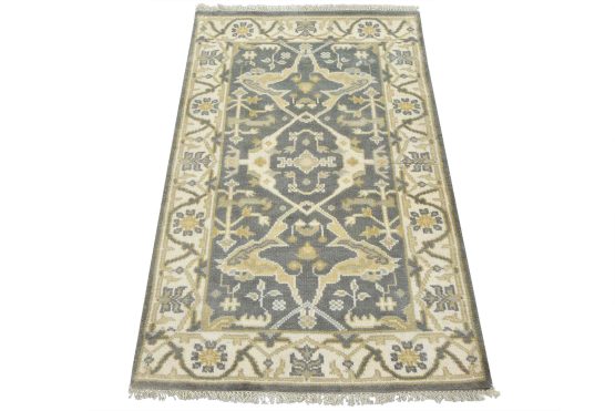 A modern tribal Oushak rug hand-knotted with an all-wool pile on a cotton foundation. This oriental rug features a central medallion surrounded by botanical designs set against a gray background. It is new and in excellent condition.