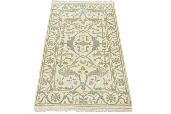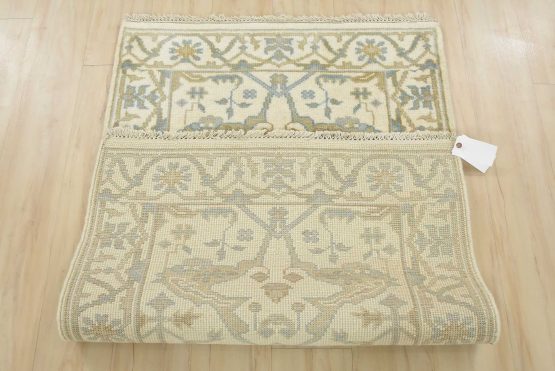A modern tribal Oushak rug hand-knotted with an all-wool pile on a cotton foundation. This oriental rug features a central medallion surrounded by botanical designs set against an ivory background. It is new and in excellent condition.