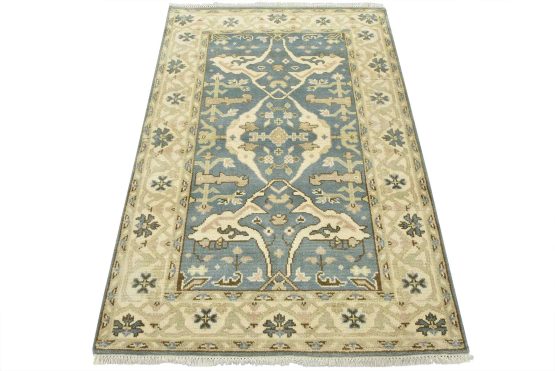A modern tribal Oushak rug hand-knotted with an all-wool pile on a cotton foundation. This oriental rug features a central medallion surrounded by botanical designs set against a blue background. It is new and in excellent condition.