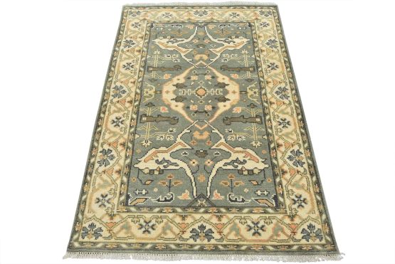 A modern tribal Oushak rug hand-knotted with an all-wool pile on a cotton foundation. This oriental rug features a central medallion surrounded by botanical designs set against a gray background. It is new and in excellent condition.