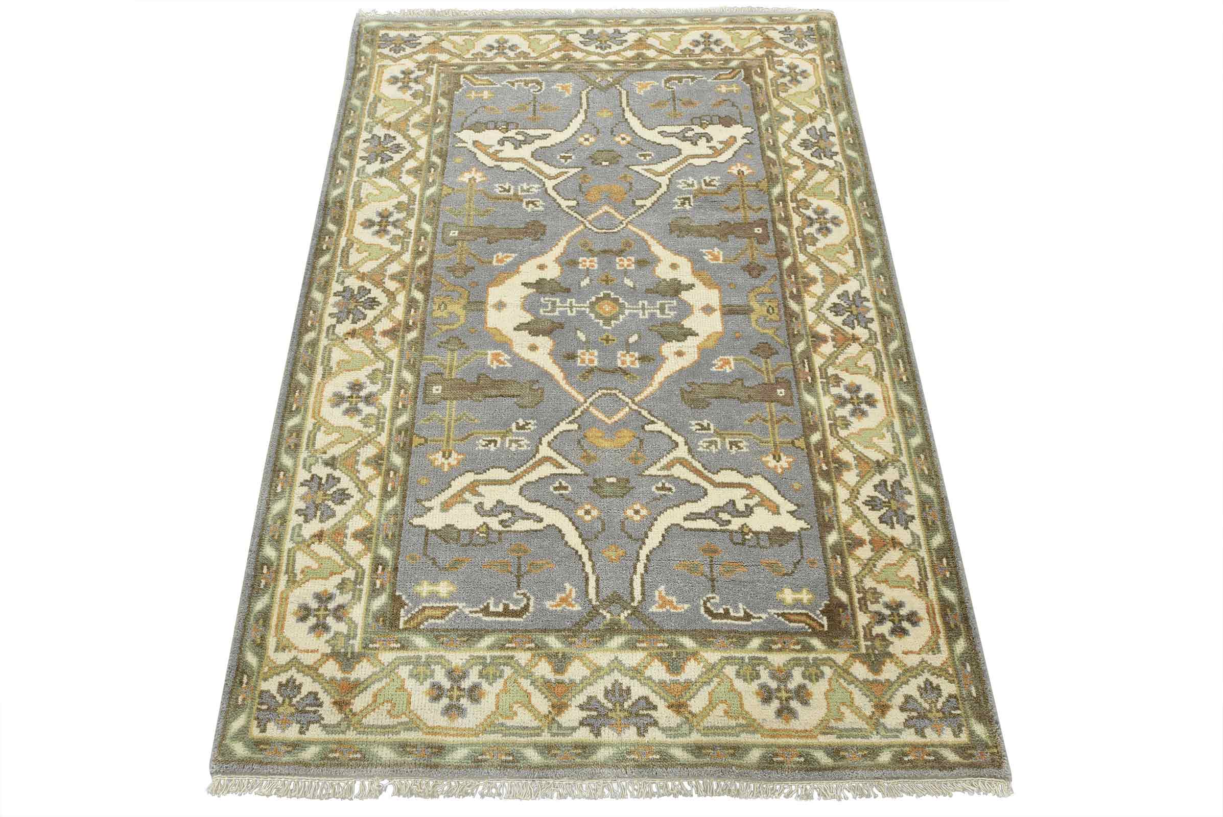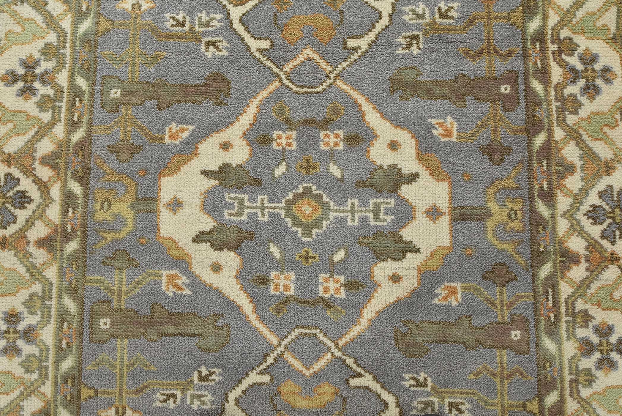 A modern tribal Oushak rug hand-knotted with an all-wool pile on a cotton foundation. This oriental rug features subtle colors with a central medallion surrounded by a botanical design set against a gray background. It is new and in excellent condition.