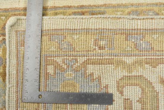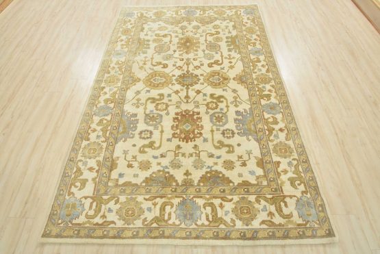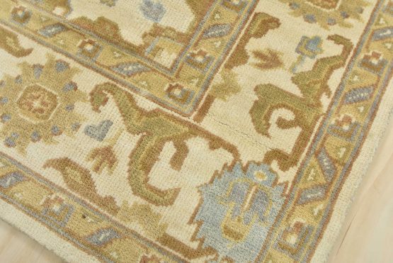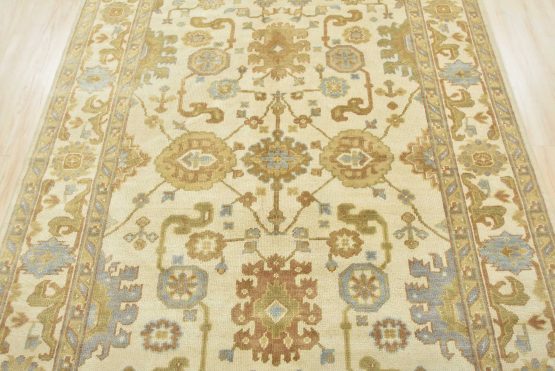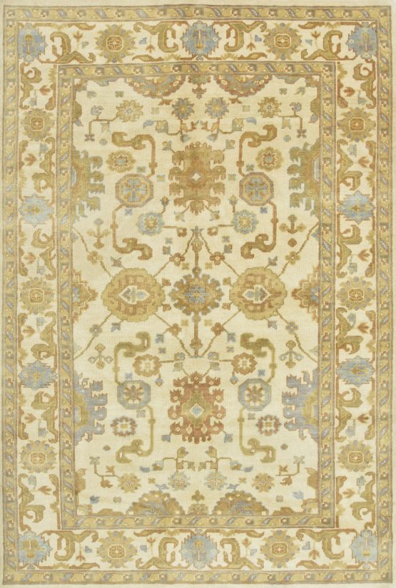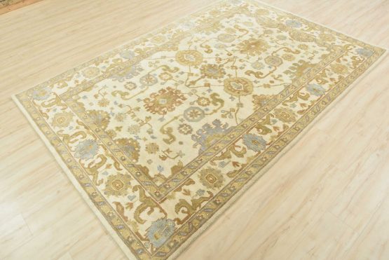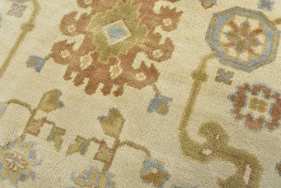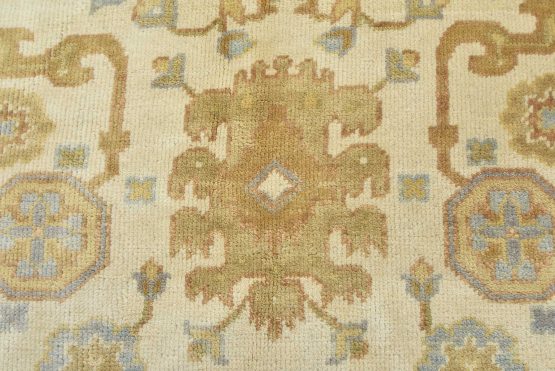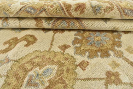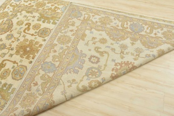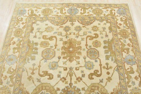A modern traditional Oushak rug hand-knotted with an all-wool pile on a cotton foundation. This oriental rug features a subtle all-over botanical design set against an ivory background. It is new and in excellent condition.