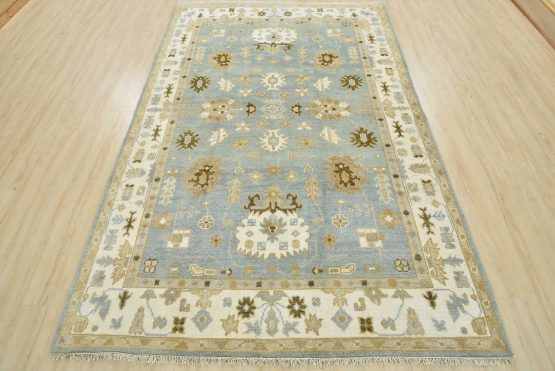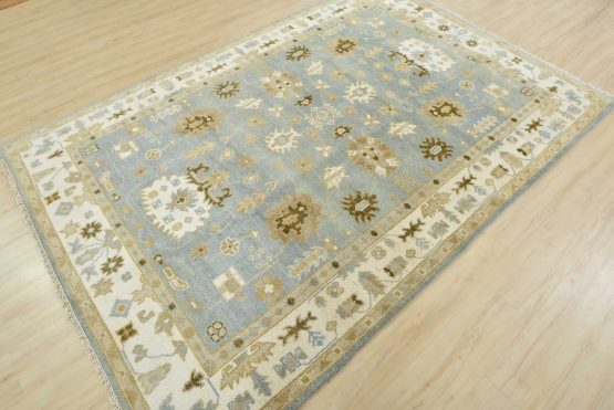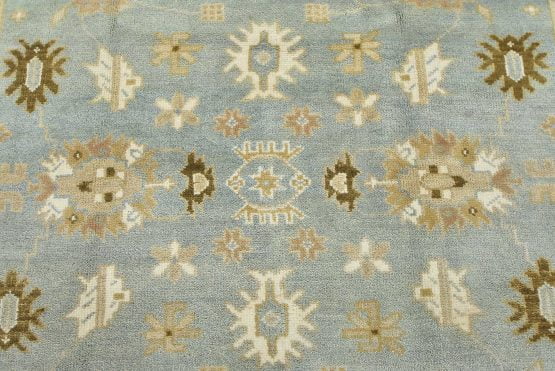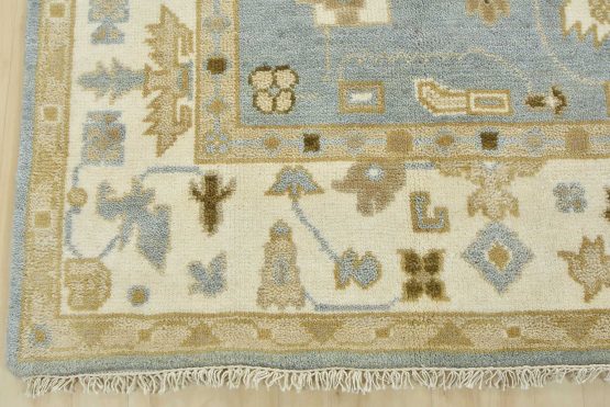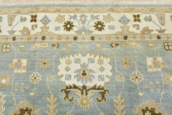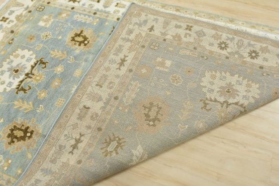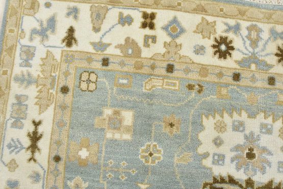 A modern traditional Oushak rug hand-knotted with an all-wool pile on a cotton foundation. This oriental rug features an all-over botanical design set against a light blue background. It is new and in excellent condition.