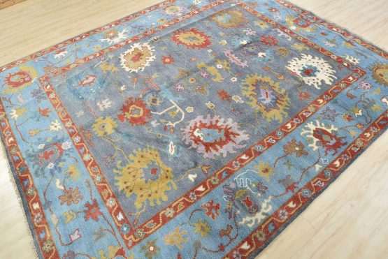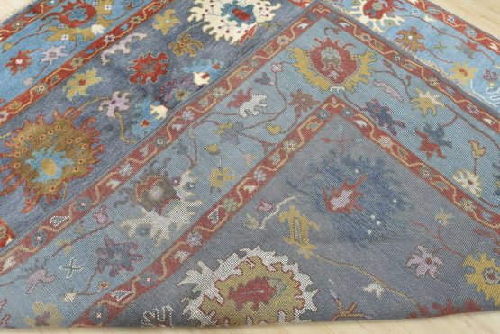 A modern traditional Oushak rug hand-knotted with an all-wool pile on a cotton foundation. This oriental rug features an all-over botanical design set against a blue background. It is new and in excellent condition.