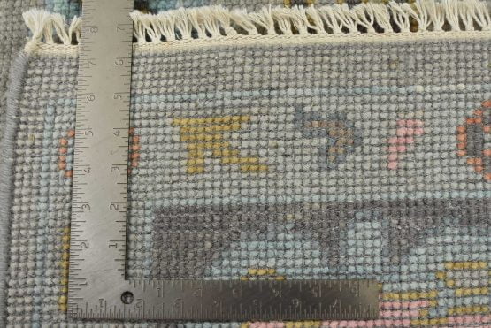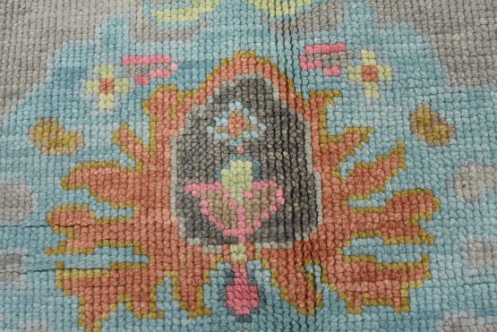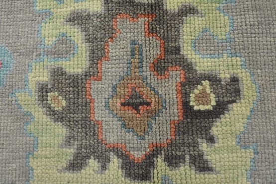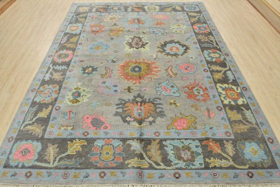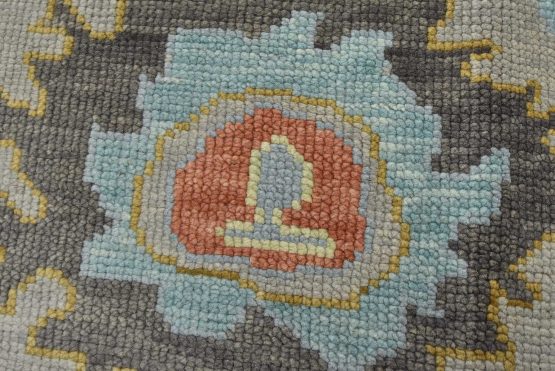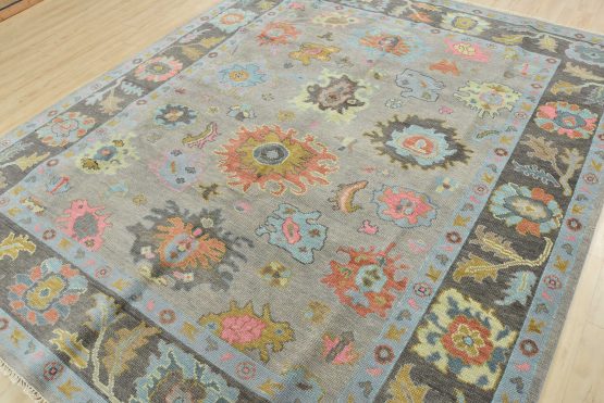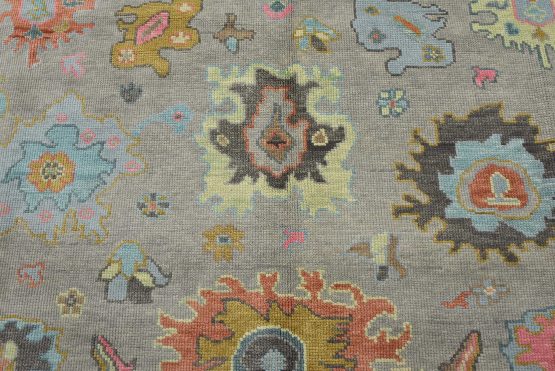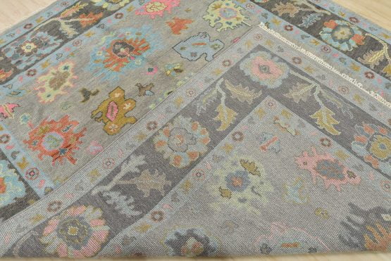 A modern traditional Oushak rug hand-knotted with an all-wool pile on a cotton foundation. This oriental rug features an all-over botanical design set against a gray background. It is new and in excellent condition.