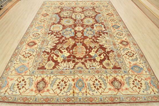 A traditional Oushak rug hand-knotted with a wool pile with viscose highlights on a cotton foundation. This oriental rug features an all-over botanical design set against a red background. It is new and in excellent condition.