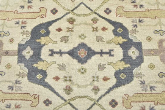 A modern tribal Oushak rug hand-knotted with an all-wool pile on a cotton foundation. This oriental rug features a central medallion surrounded by botanical designs set against an ivory background. It is new and in excellent condition.