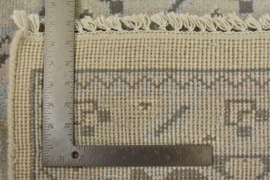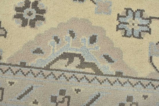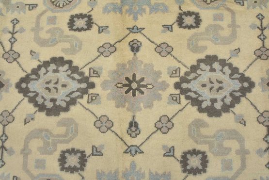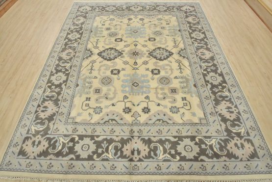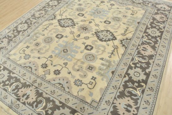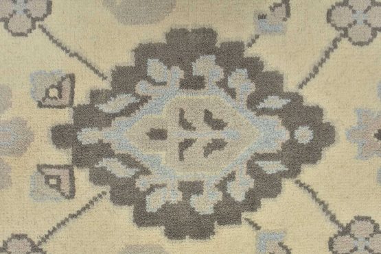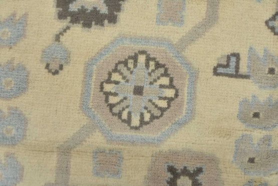 A modern traditional Oushak rug hand-knotted with an all-wool pile on a cotton foundation. This oriental rug features an all-over botanical design set against an ivory background. It is new and in excellent condition.