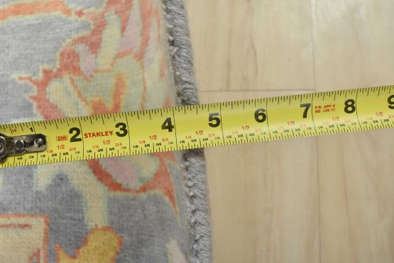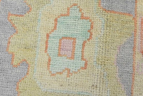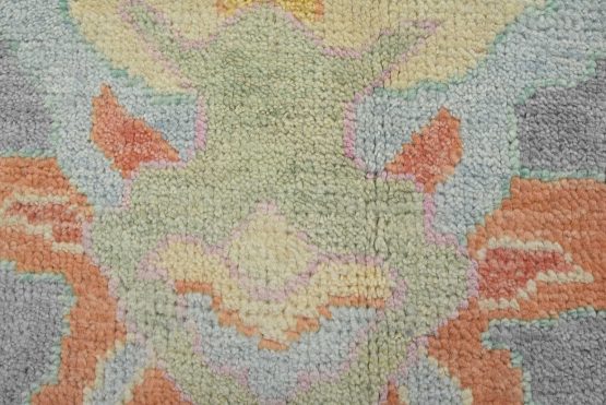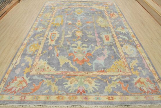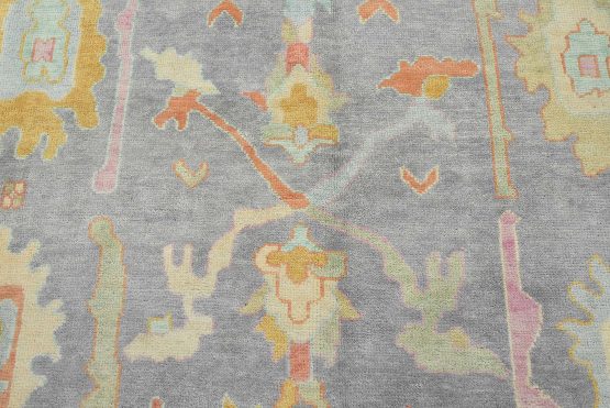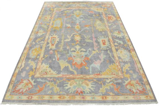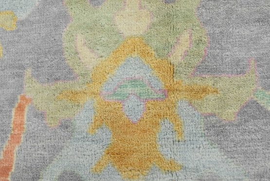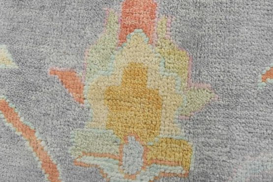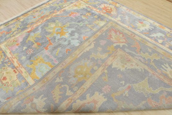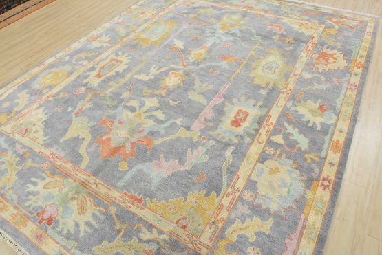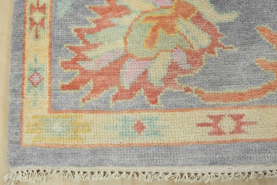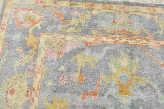 A modern traditional Oushak rug hand-knotted with an all-wool pile on a cotton foundation. This oriental rug features an all-over botanical design set against a gray background. It is new and in excellent condition.