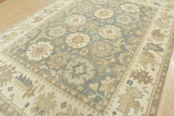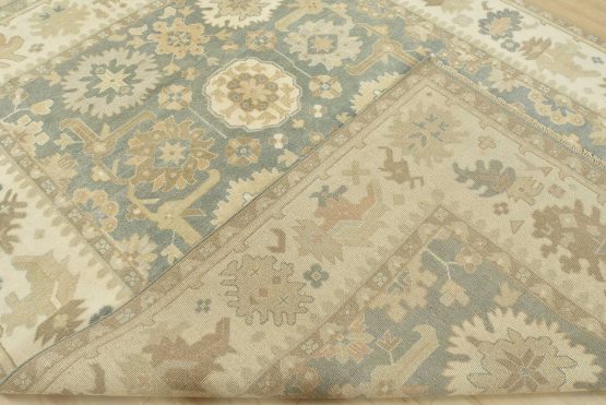 A traditional Oushak rug hand-knotted with an all-wool pile on a cotton foundation. This oriental rug features an all-over botanical design set against a blue background. It is new and in excellent condition.