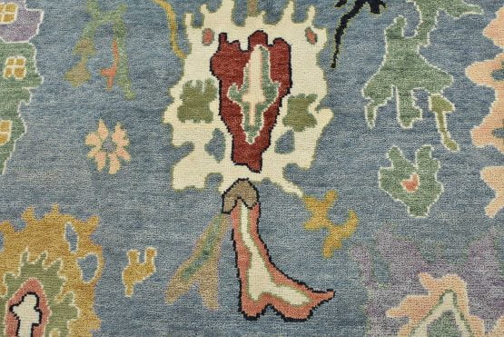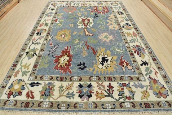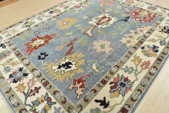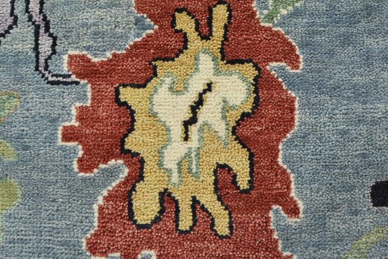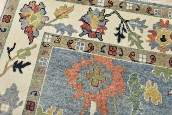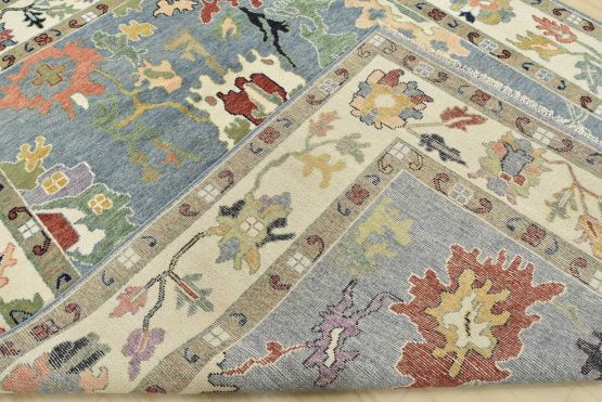 A traditional Oushak rug is hand-knotted with an all-wool pile on a cotton foundation. This oriental rug features an all-over botanical design set against a blue background. It is new and in excellent condition.
