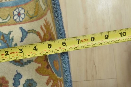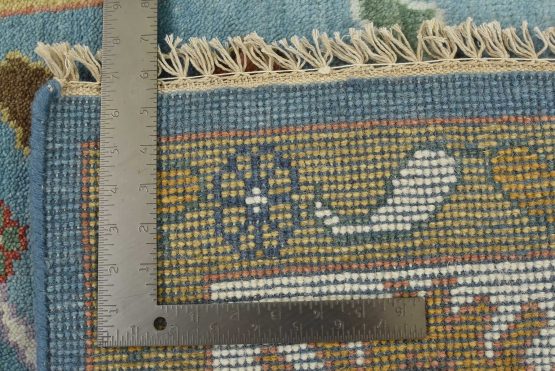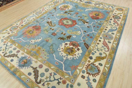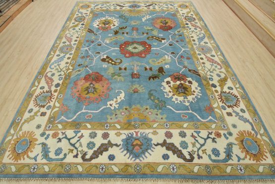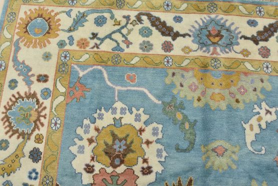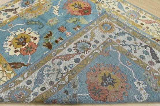 A traditional Oushak rug is hand-knotted with an all-wool pile on a cotton foundation. This oriental rug features an all-over botanical design set against a blue background. It is new and in excellent condition.
