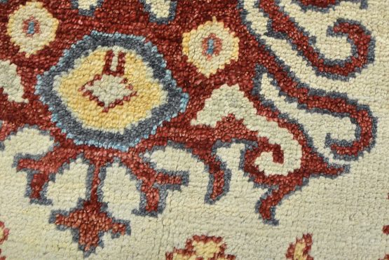A traditional Oushak rug hand-knotted with an all-wool pile on a cotton foundation. This oriental rug features an all-over botanical design set against an ivory background. It is new and in excellent condition.