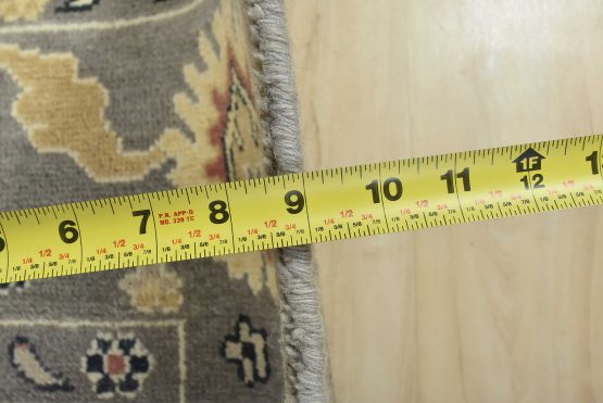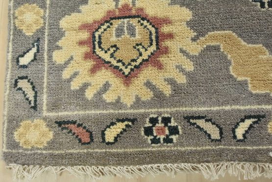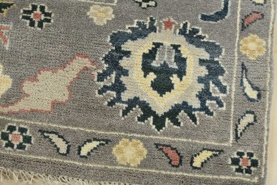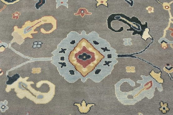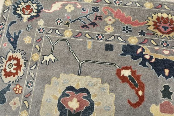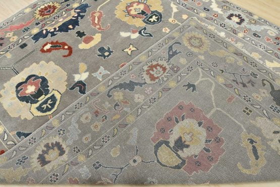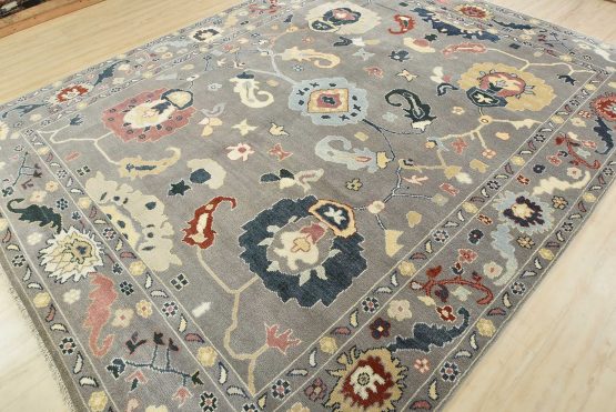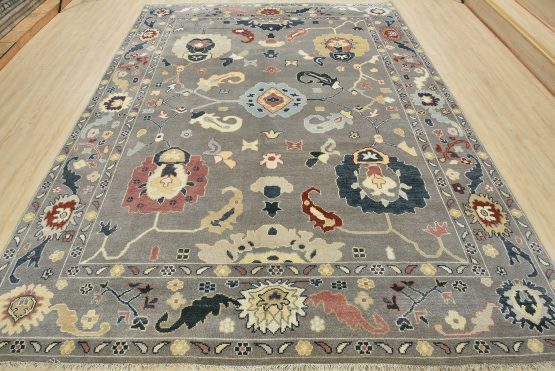 A modern traditional Oushak rug hand-knotted with an all-wool pile on a cotton foundation. This oriental rug features an all-over botanical design set against a gray background. It is new and in excellent condition.