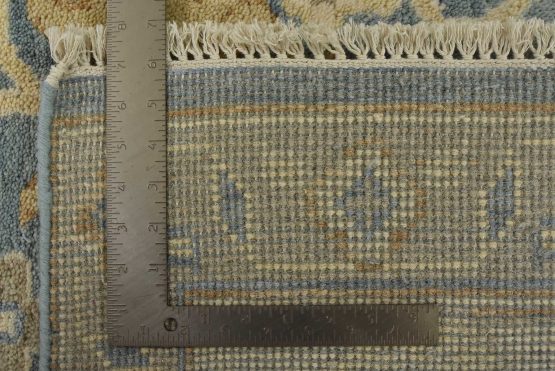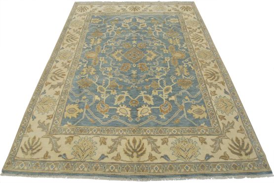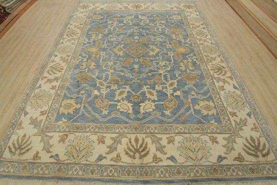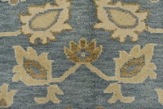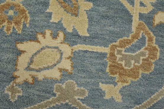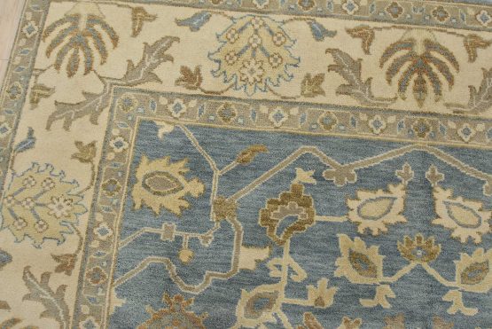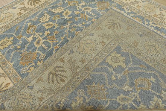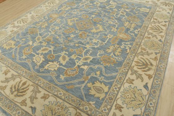 A traditional Oushak rug is hand-knotted with an all-wool pile on a cotton foundation. This oriental rug features an all-over botanical design set against a blue background. It is new and in excellent condition.