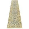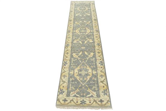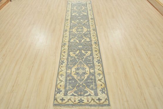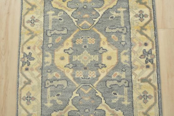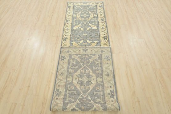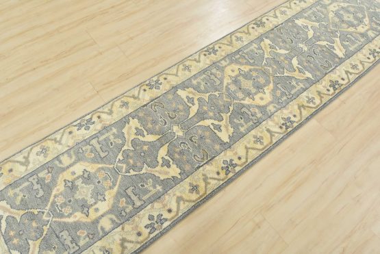 A modern tribal Oushak runner hand-knotted with an all-wool pile on a cotton foundation. This oriental rug features a subtle botanical design set against a gray background. It is new and in excellent condition.