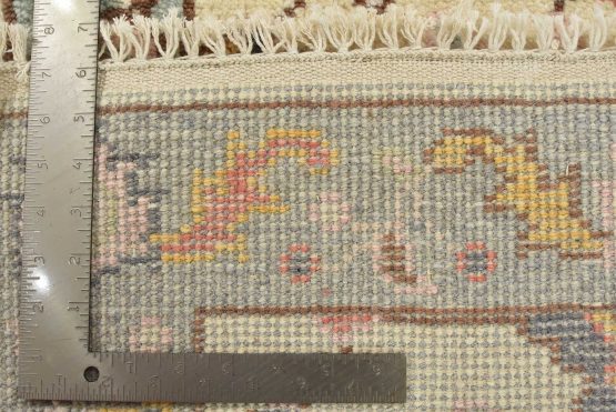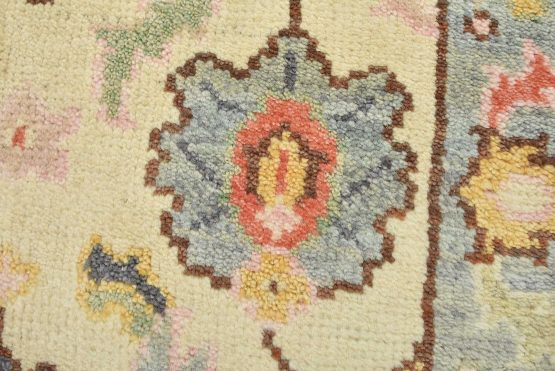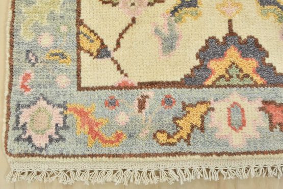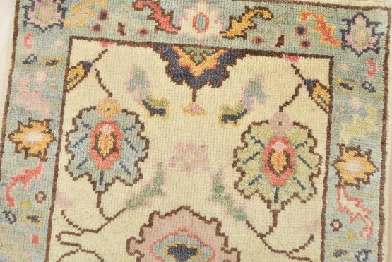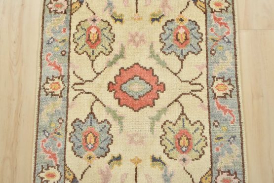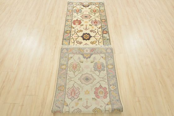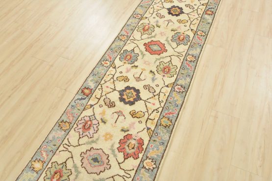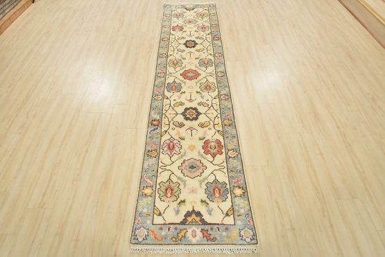 A modern traditional Oushak runner hand-knotted with an all-wool pile on a cotton foundation. This oriental rug features an all-over floral design set against an ivory background. It is new and in excellent condition.
