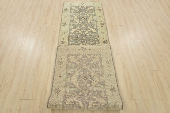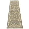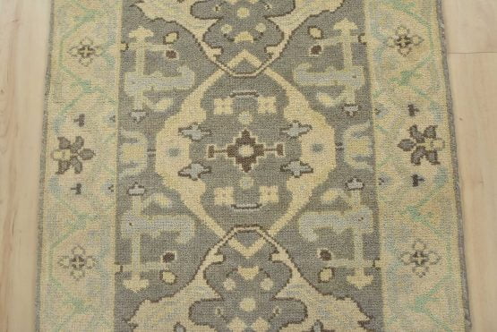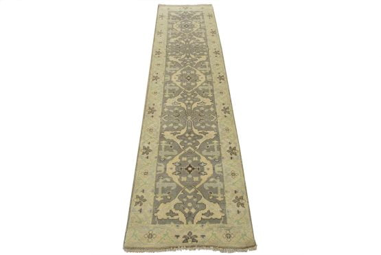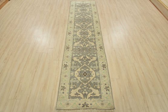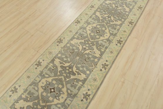 A modern tribal Oushak runner hand-knotted with an all-wool pile on a cotton foundation. This oriental rug features a subtle botanical design set against a gray background. It is new and in excellent condition.