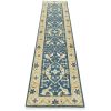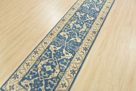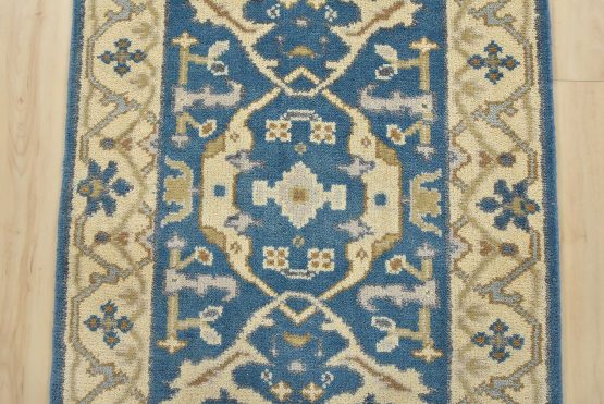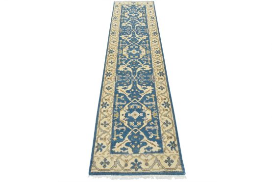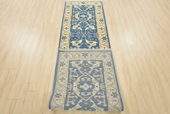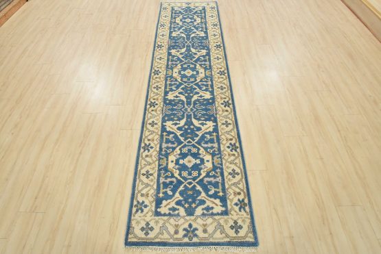 A modern tribal Oushak runner hand-knotted with an all-wool pile on a cotton foundation. This oriental rug features a botanical design set against a blue background. It is new and in excellent condition.