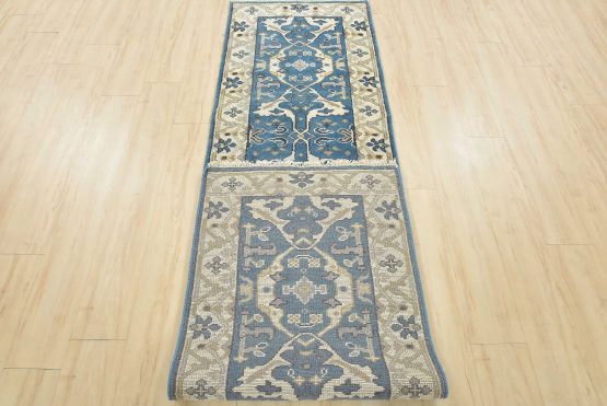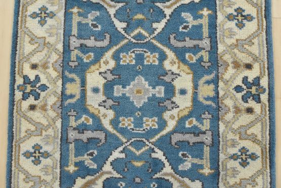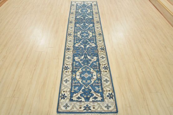 A modern tribal Oushak runner hand-knotted with an all-wool pile on a cotton foundation. This oriental rug features a botanical design set against a blue background. It is new and in excellent condition.