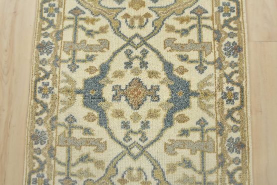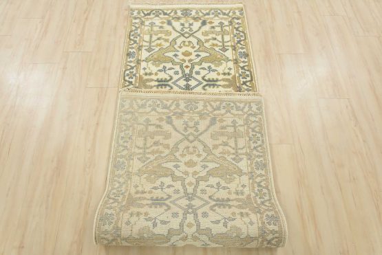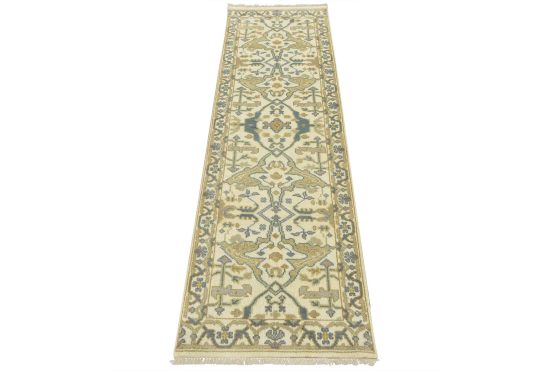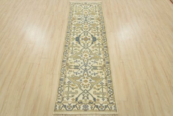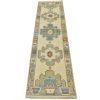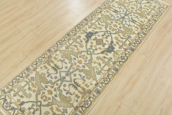A modern tribal Oushak runner rug hand-knotted with an all-wool pile on a cotton foundation. This oriental rug features a botanical design set against an ivory background. It is new and in excellent condition.
