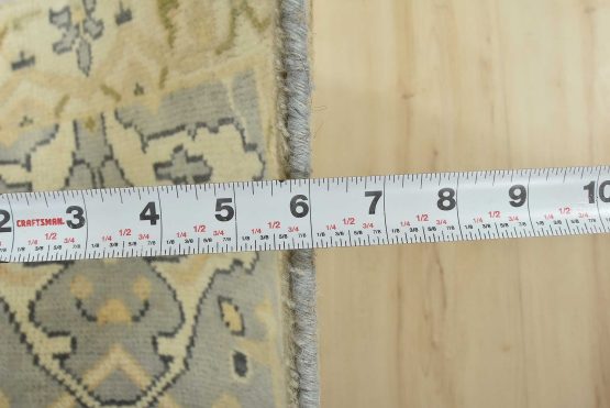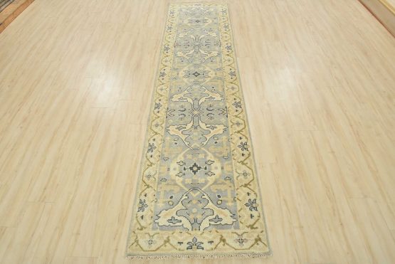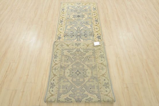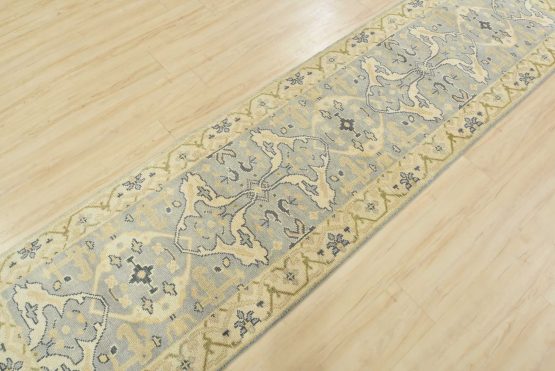 A modern tribal Oushak runner hand-knotted with an all-wool pile on a cotton foundation. This oriental rug features a subtle botanical design set against a gray background. It is new and in excellent condition.