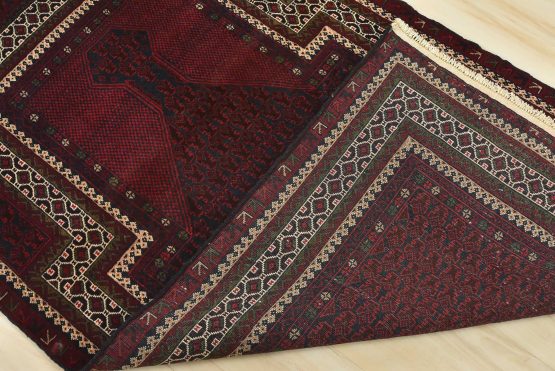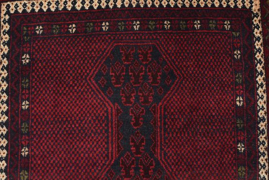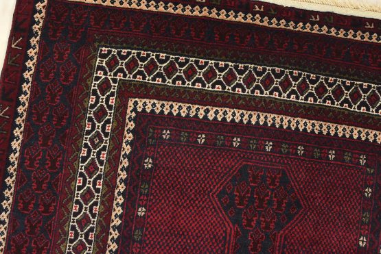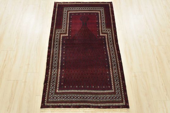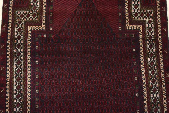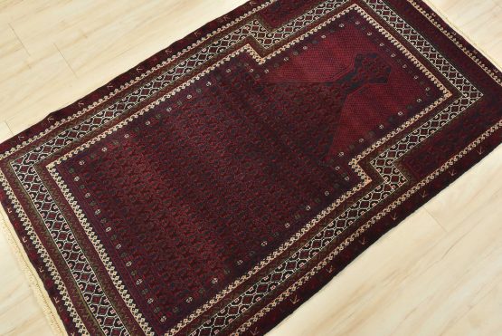 An authentic vintage tribal Baloch rug hand-knotted with fine wool and natural dyes. This nomadic prayer rug features a small-scale geometric pattern set against a dark blue background. It has a full wool pile with no worn areas and is in very good condition.