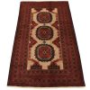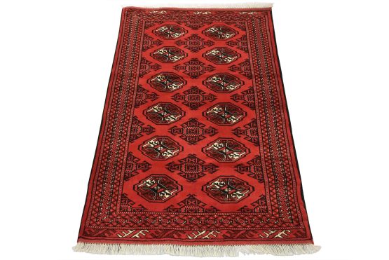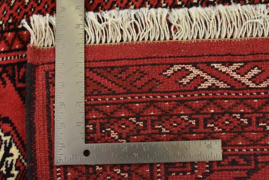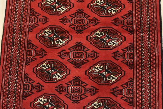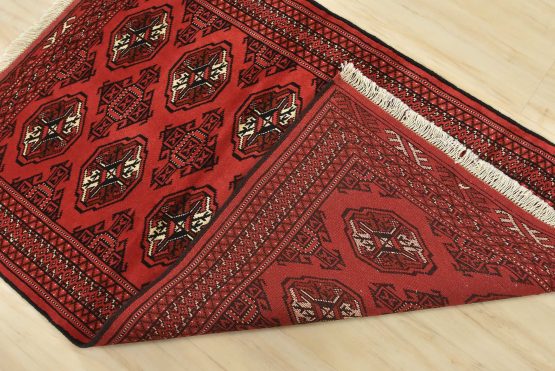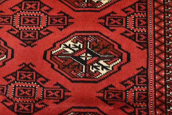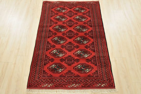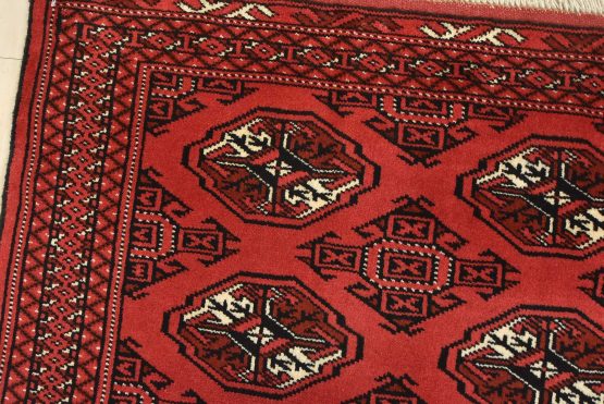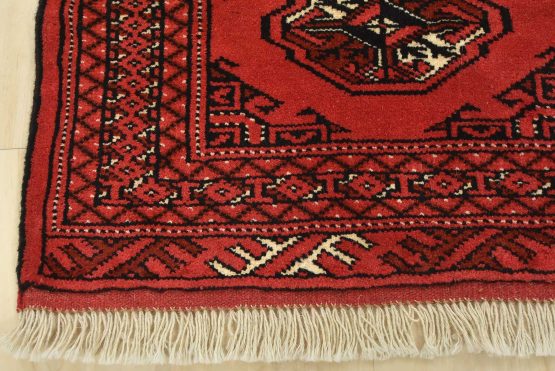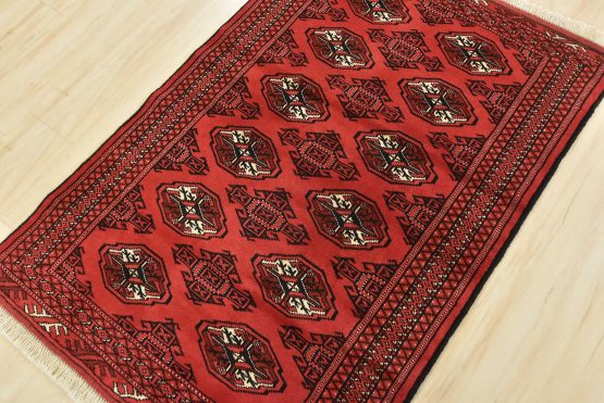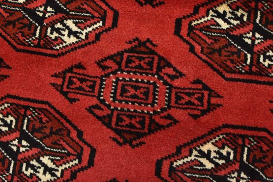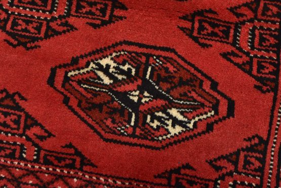 An authentic vintage tribal Turkmen rug hand-knotted with fine wool and natural dyes. This nomadic oriental rug features rows of geometric medallions set against a red background. It has a full wool pile with no worn areas and is in very good condition.
