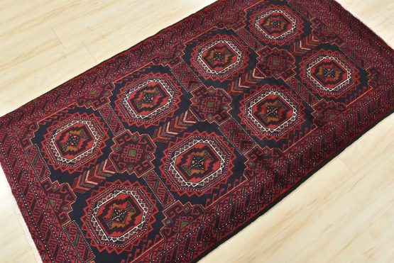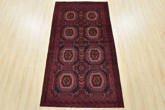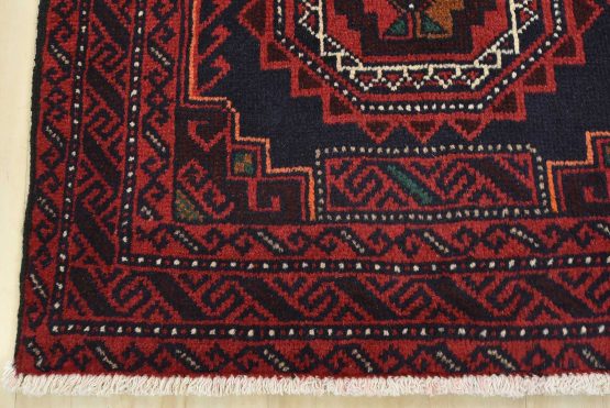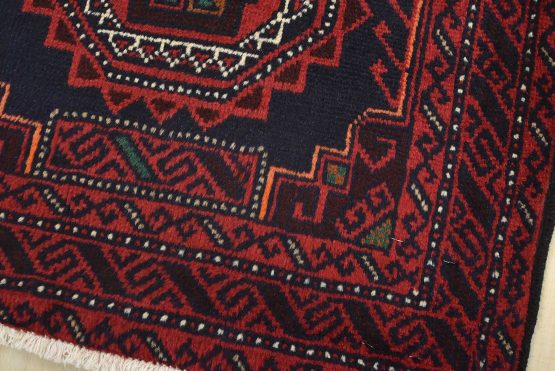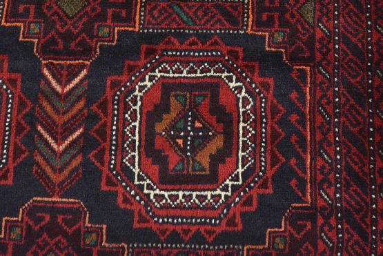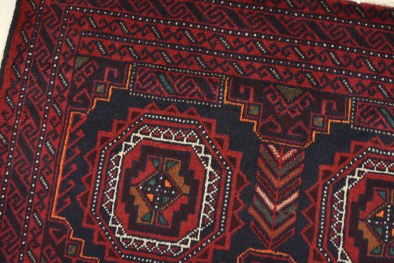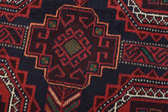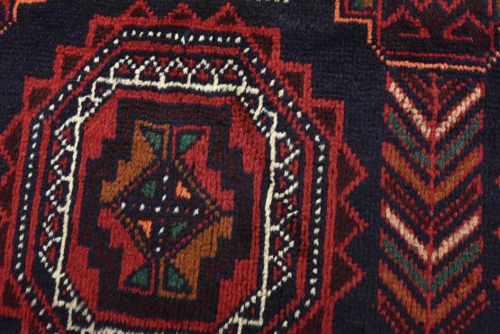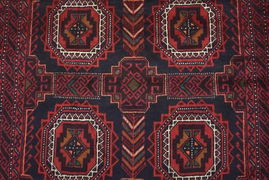 An authentic vintage tribal Baloch rug hand-knotted with fine wool and natural dyes. This nomadic oriental rug features two rows of geometric medallions set against a blue background. It has a full wool pile with no worn areas and is in very good condition.
