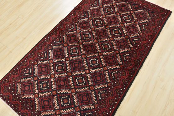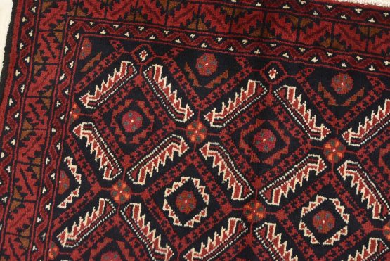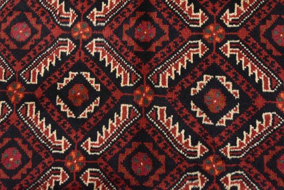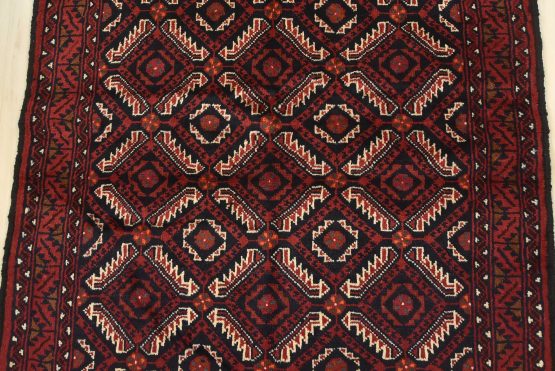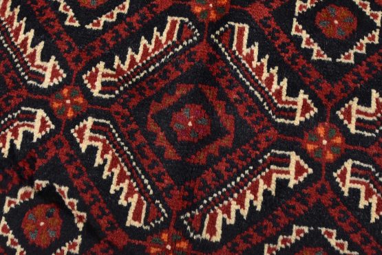 An authentic vintage tribal Baloch rug hand-knotted with fine wool and natural dyes. This nomadic oriental rug features an all-over geometric pattern set against a dark blue background. It has a full wool pile with no worn areas and is in very good condition.
